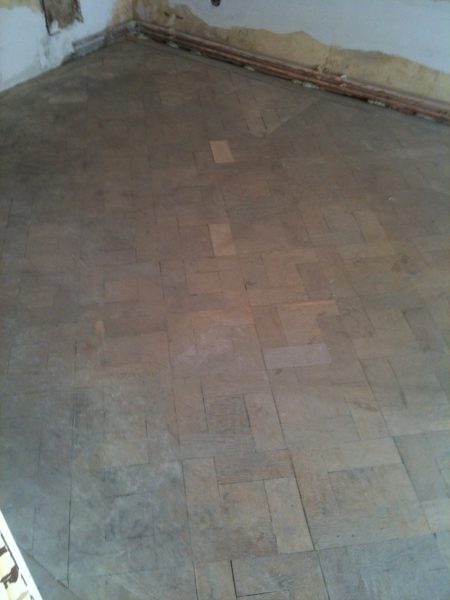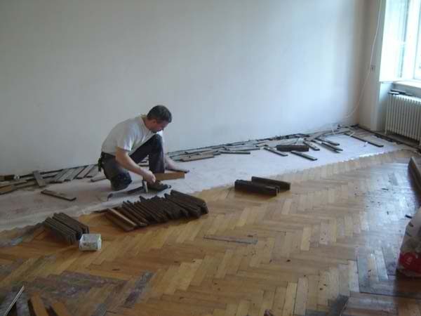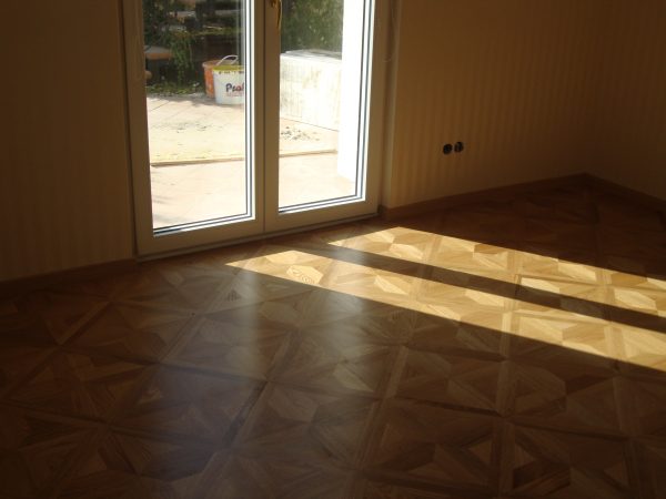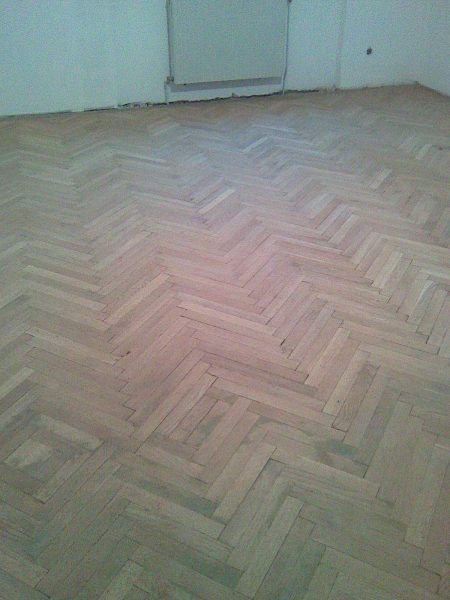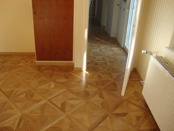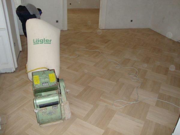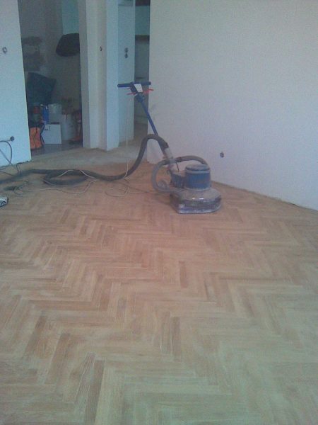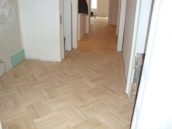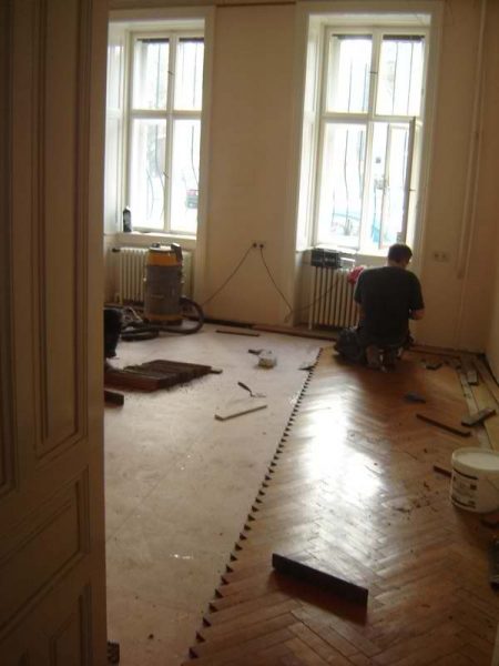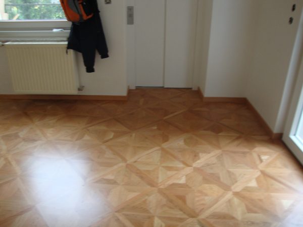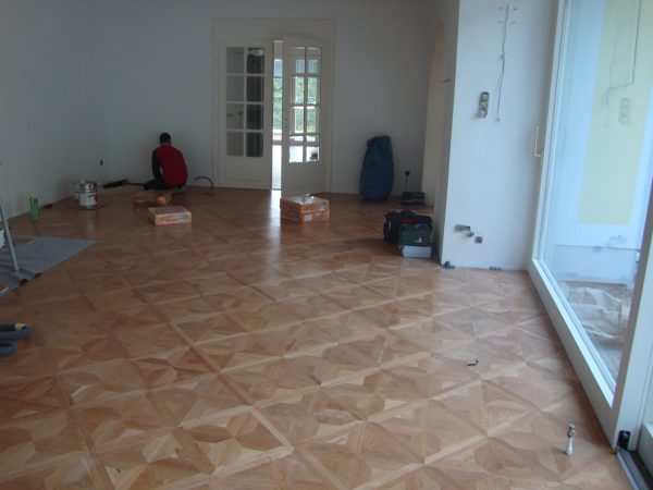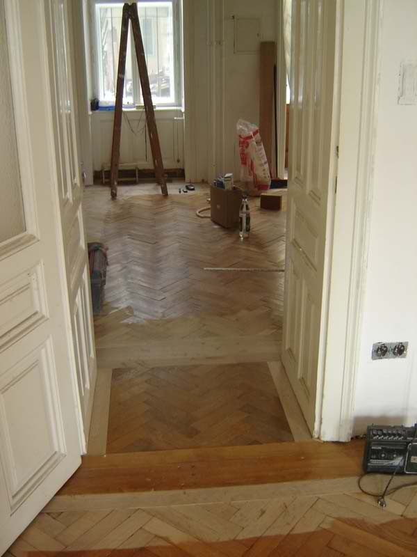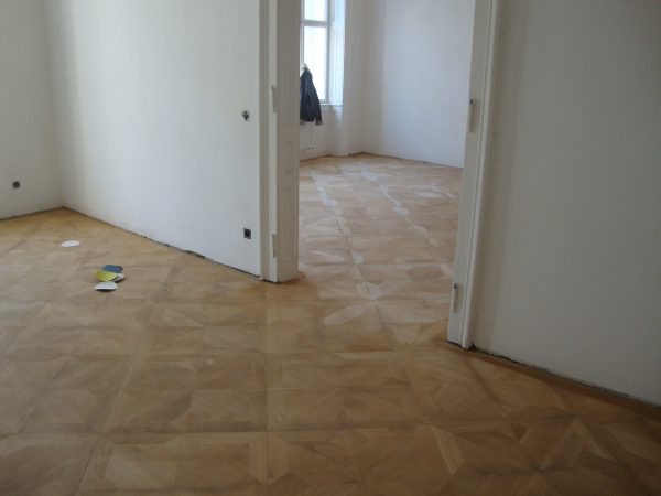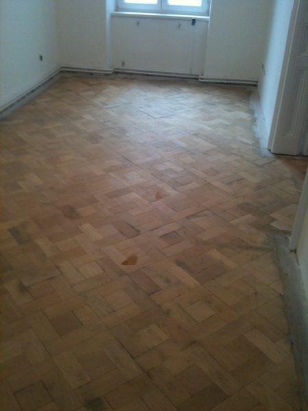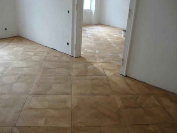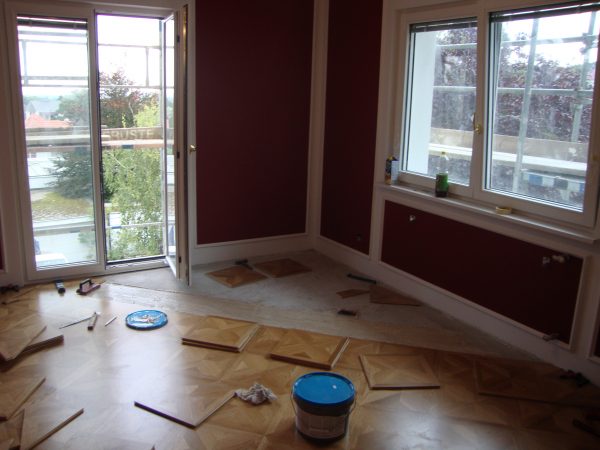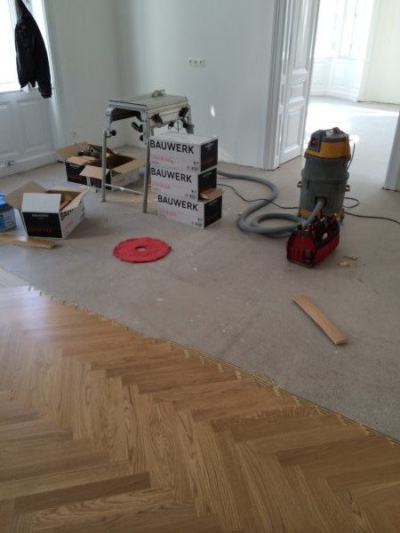 Ca. 70 Jahre alter Stabparkett in Flechtemuster verlegt wurde entfernt, sortiert, entnagelt und gereinigt. Der Blindboden wurde teilweise geöffnet bzw. angehoben, Polsterhölzer in Waage gebracht und wieder musterartig verlegt, genagelt, geschliffen und versiegelt.