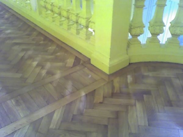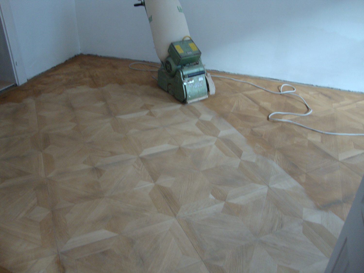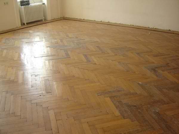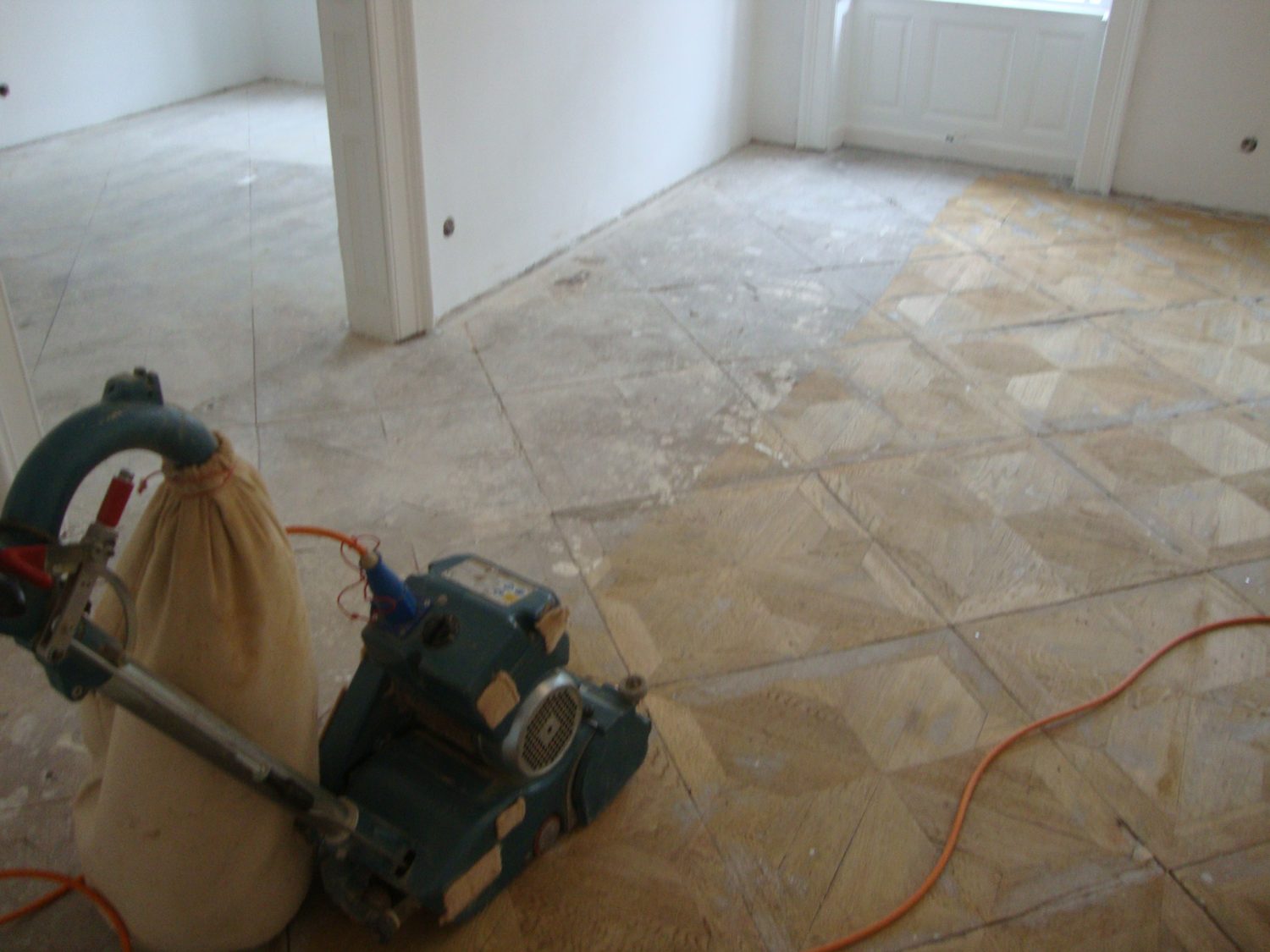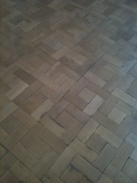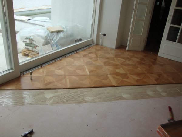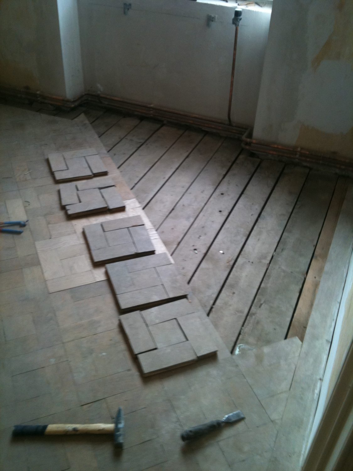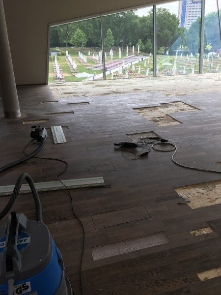 Ca. 70 Jahre alter Stabparkett in Flechtemuster verlegt wurde entfernt, sortiert, entnagelt und gereinigt. Der Blindboden wurde teilweise geöffnet bzw. angehoben, Polsterhölzer in Waage gebracht und wieder musterartig verlegt, genagelt, geschliffen und versiegelt.