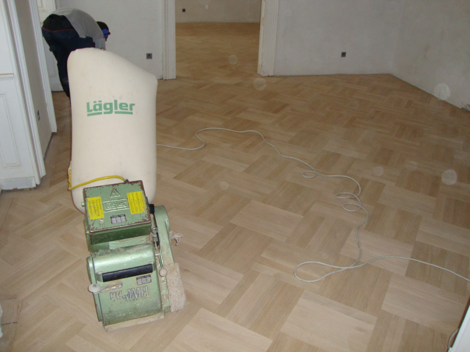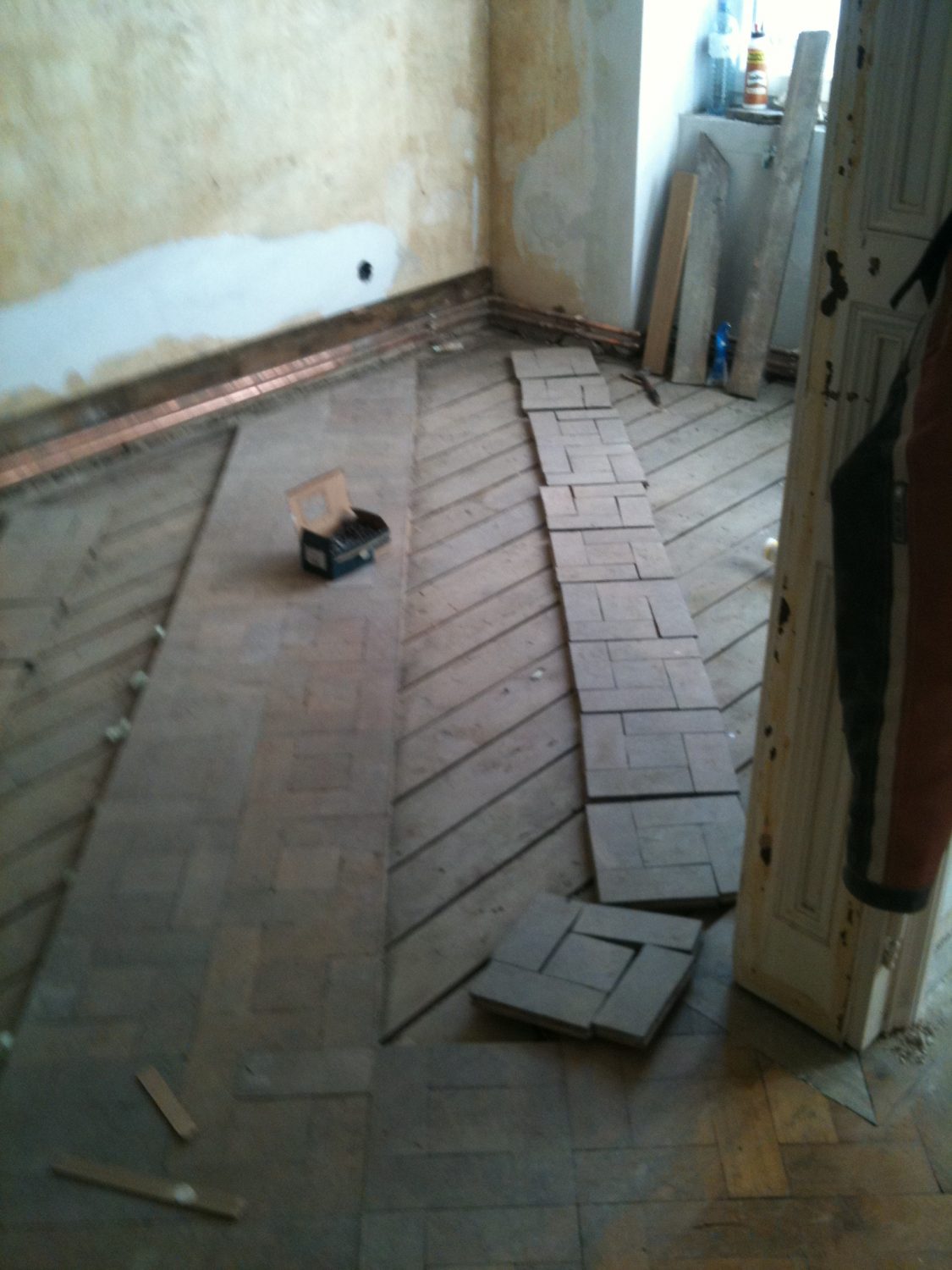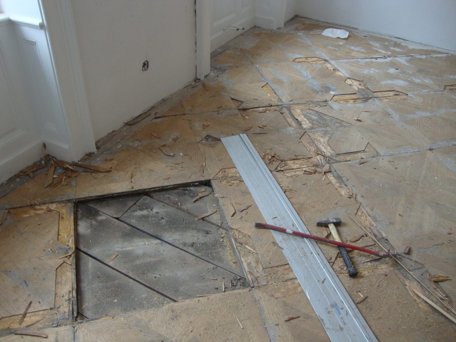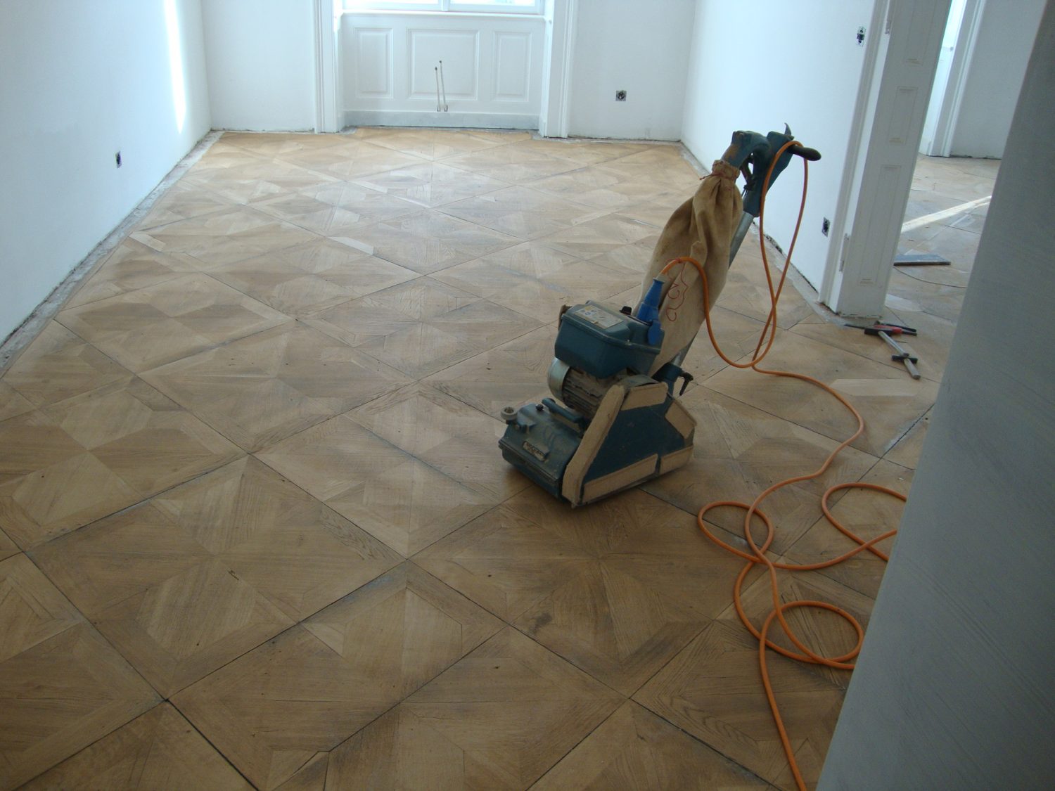 Ca. 70 Jahre alter Stabparkett in Flechtemuster verlegt wurde entfernt, sortiert, entnagelt und gereinigt. Der Blindboden wurde teilweise geöffnet bzw. angehoben, Polsterhölzer in Waage gebracht und wieder musterartig verlegt, genagelt, geschliffen und versiegelt.