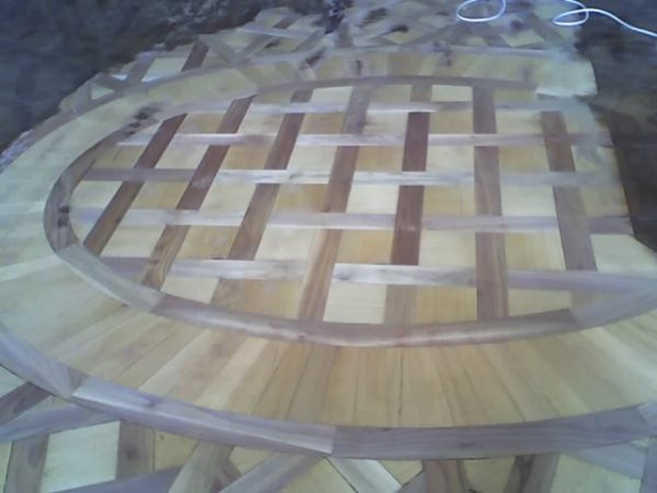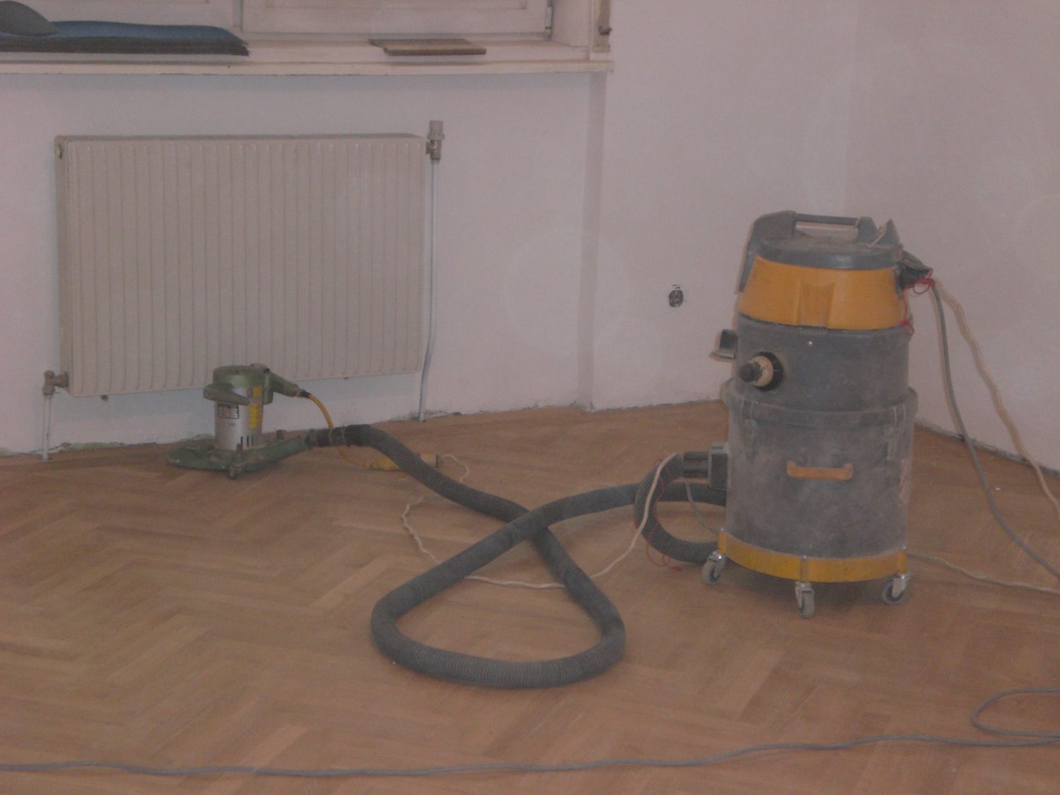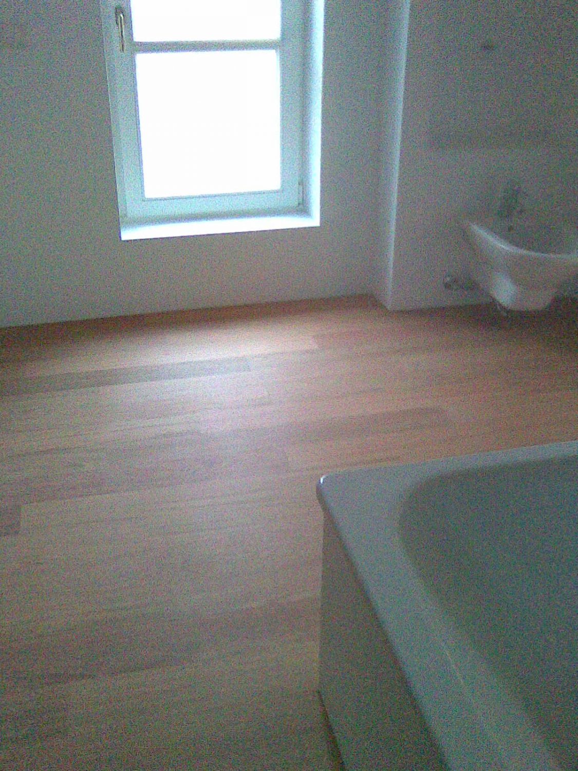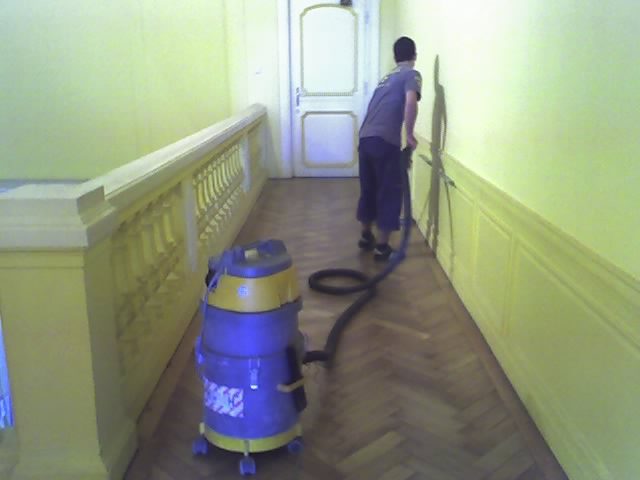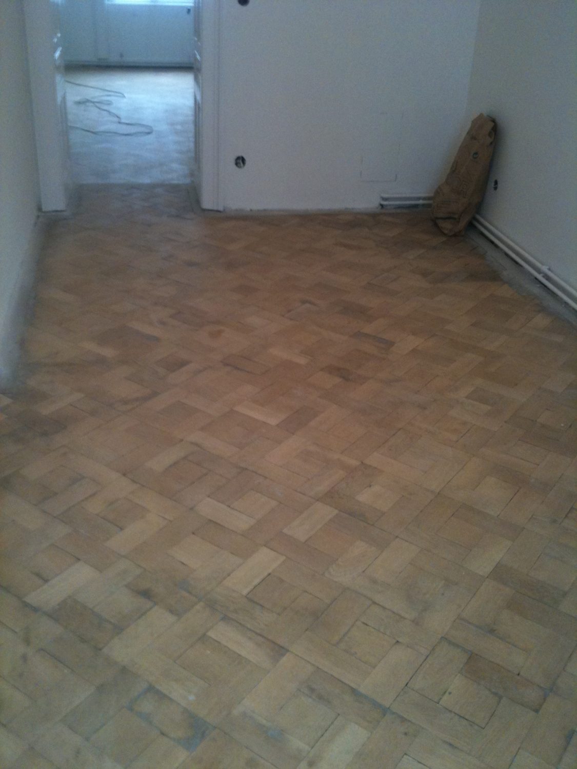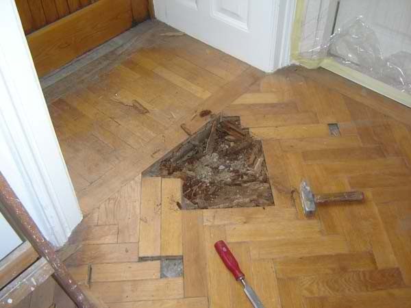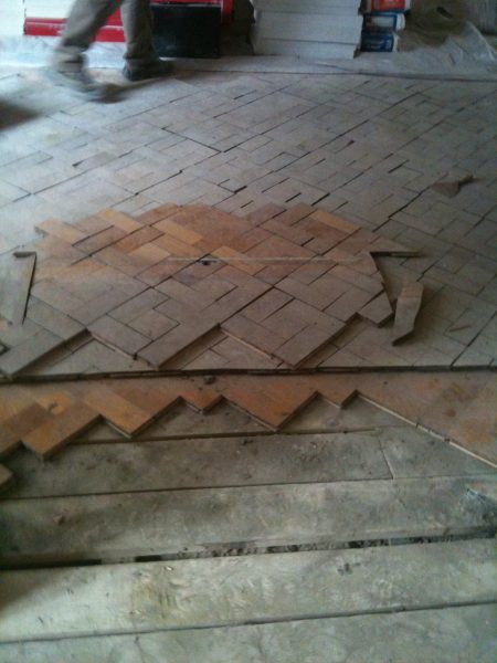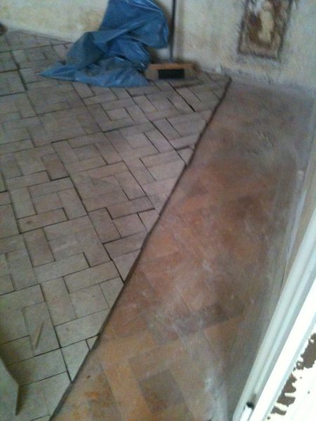 Ca. 70 Jahre alter Stabparkett in Flechtemuster verlegt wurde entfernt, sortiert, entnagelt und gereinigt. Der Blindboden wurde teilweise geöffnet bzw. angehoben, Polsterhölzer in Waage gebracht und wieder musterartig verlegt, genagelt, geschliffen und versiegelt.