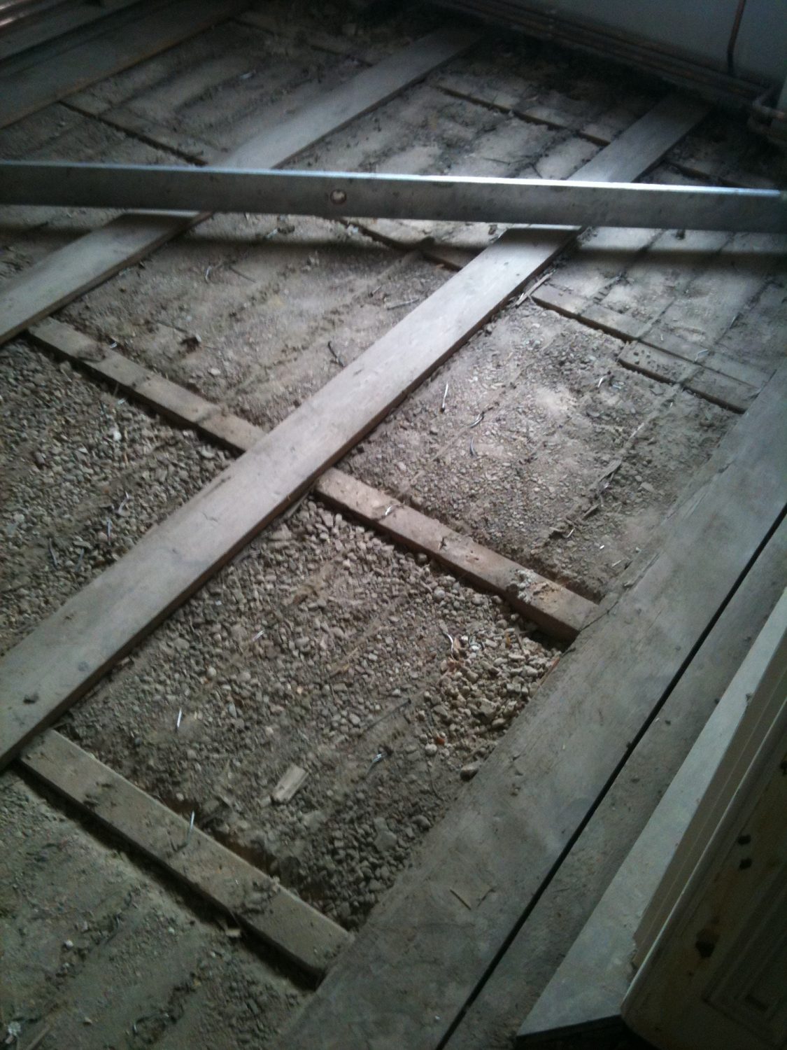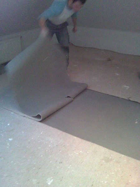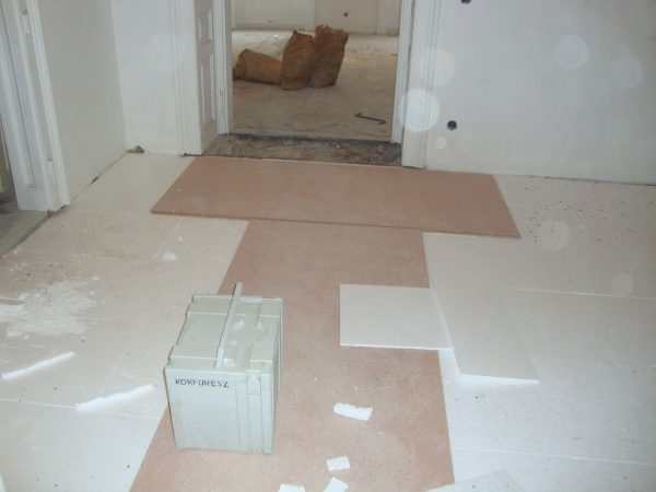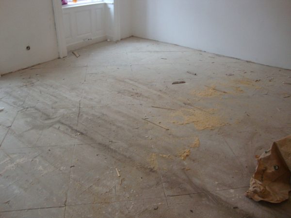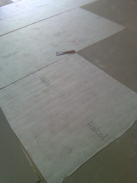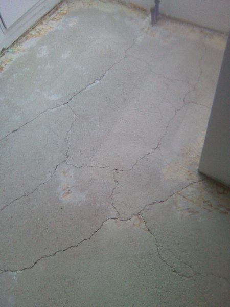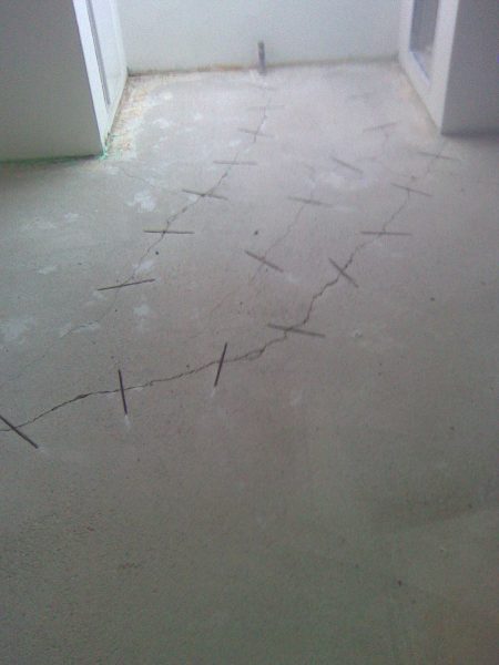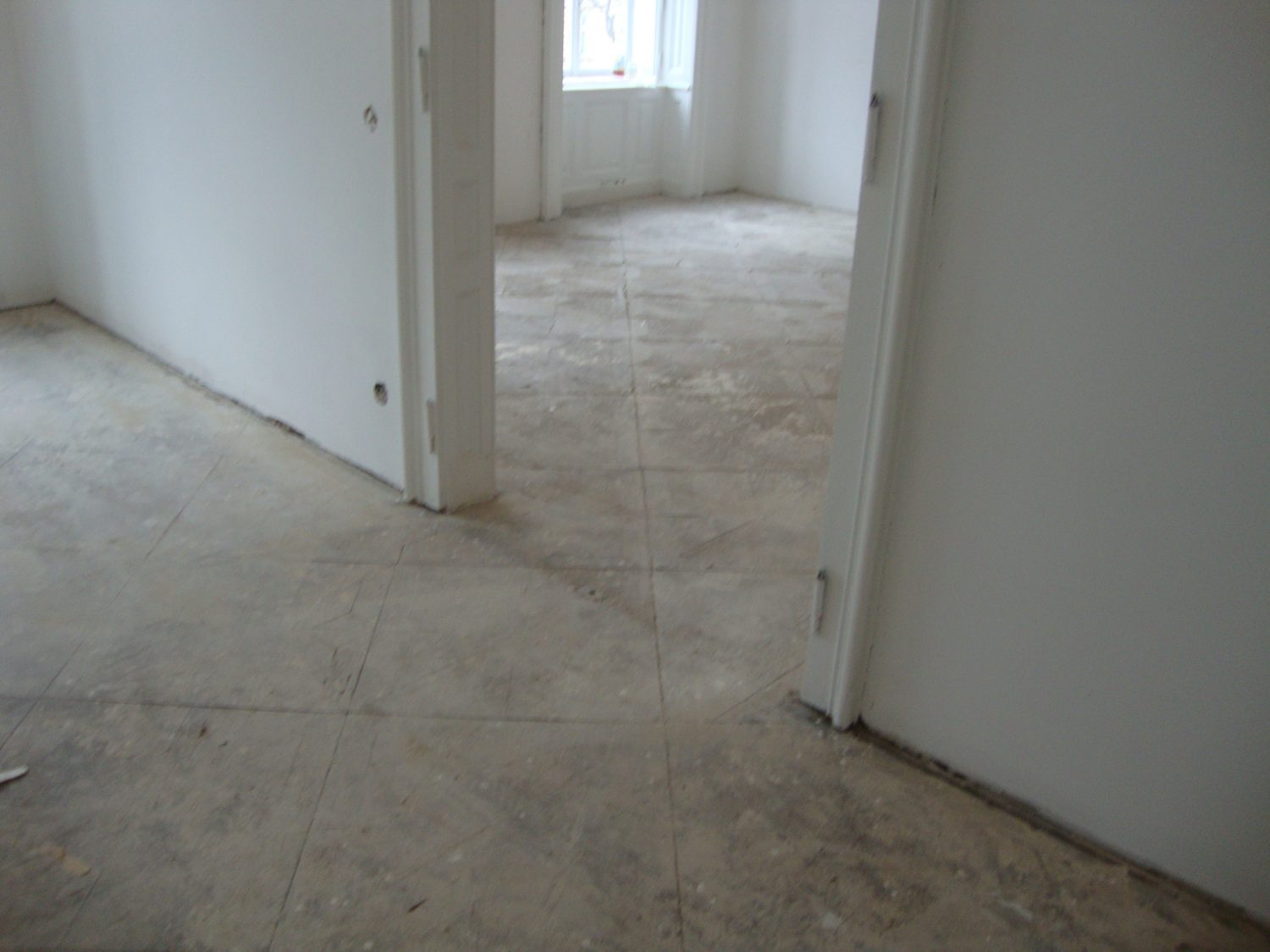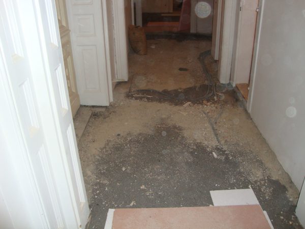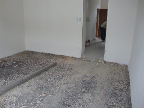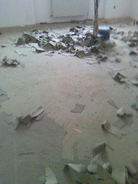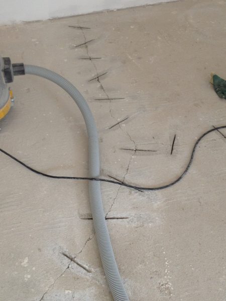 Im Rahmen dieser Sanierung haben wir den an vielen Stellen gebrochenen Estrich geklammert und das Entkopplungsvlies verklebt. Die Klammern schützen vor weiteren Bewegungen des Estrichs und das Entkopplungsvlies erhöht die Haftzugfestigkeit.