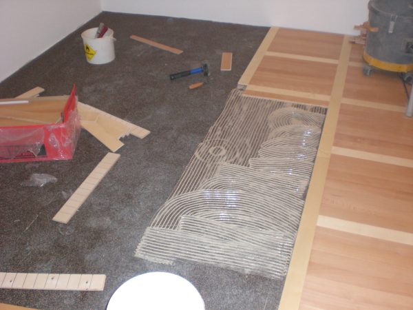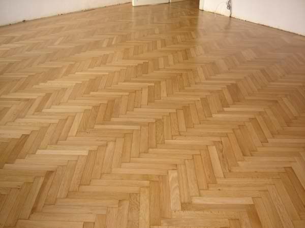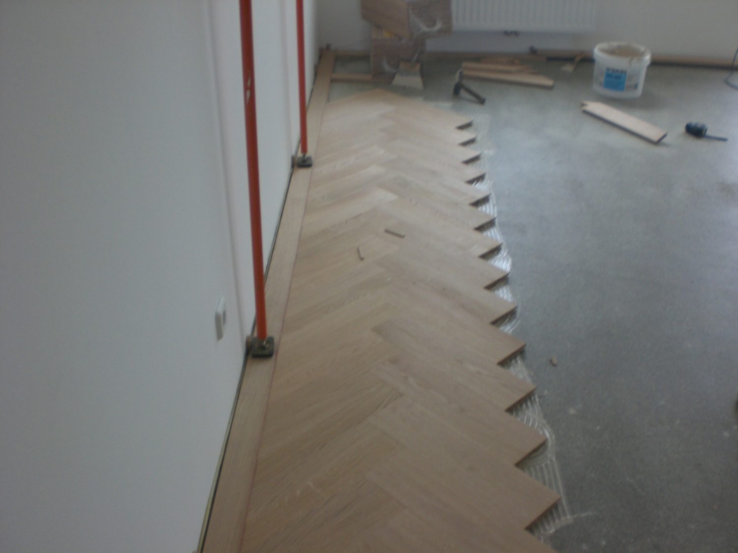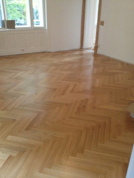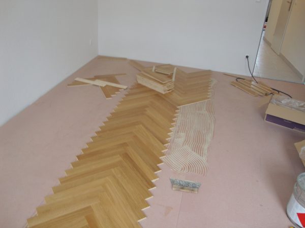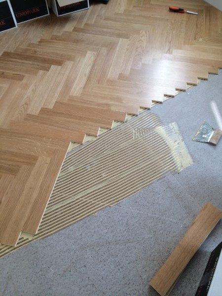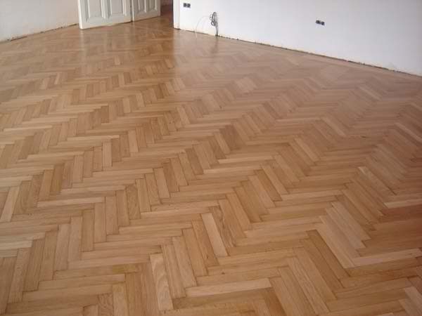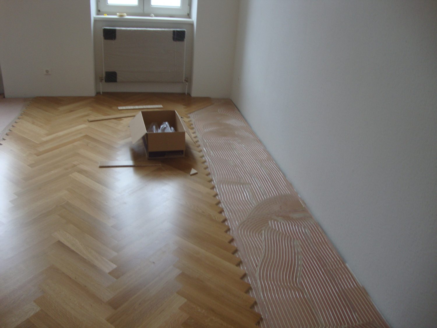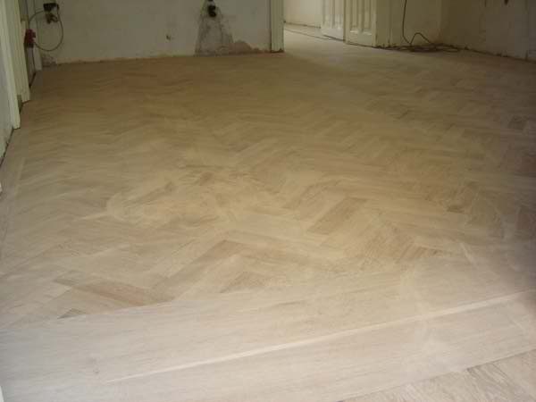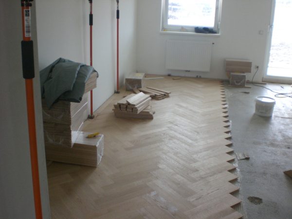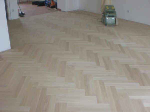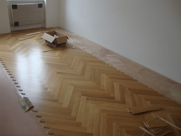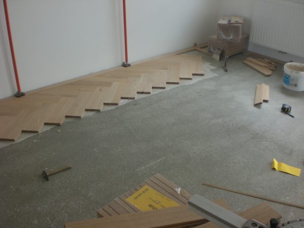 Unterboden ausgeglichen und Verlegeplatten ausgelegt. Anschließend Stabparkett in mehrfach Fischgrätmuster verlegt, vollflächig verklebt.