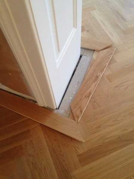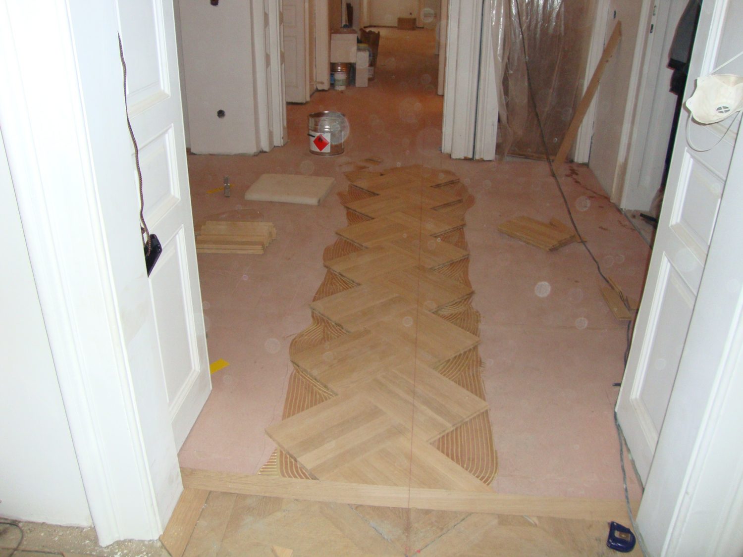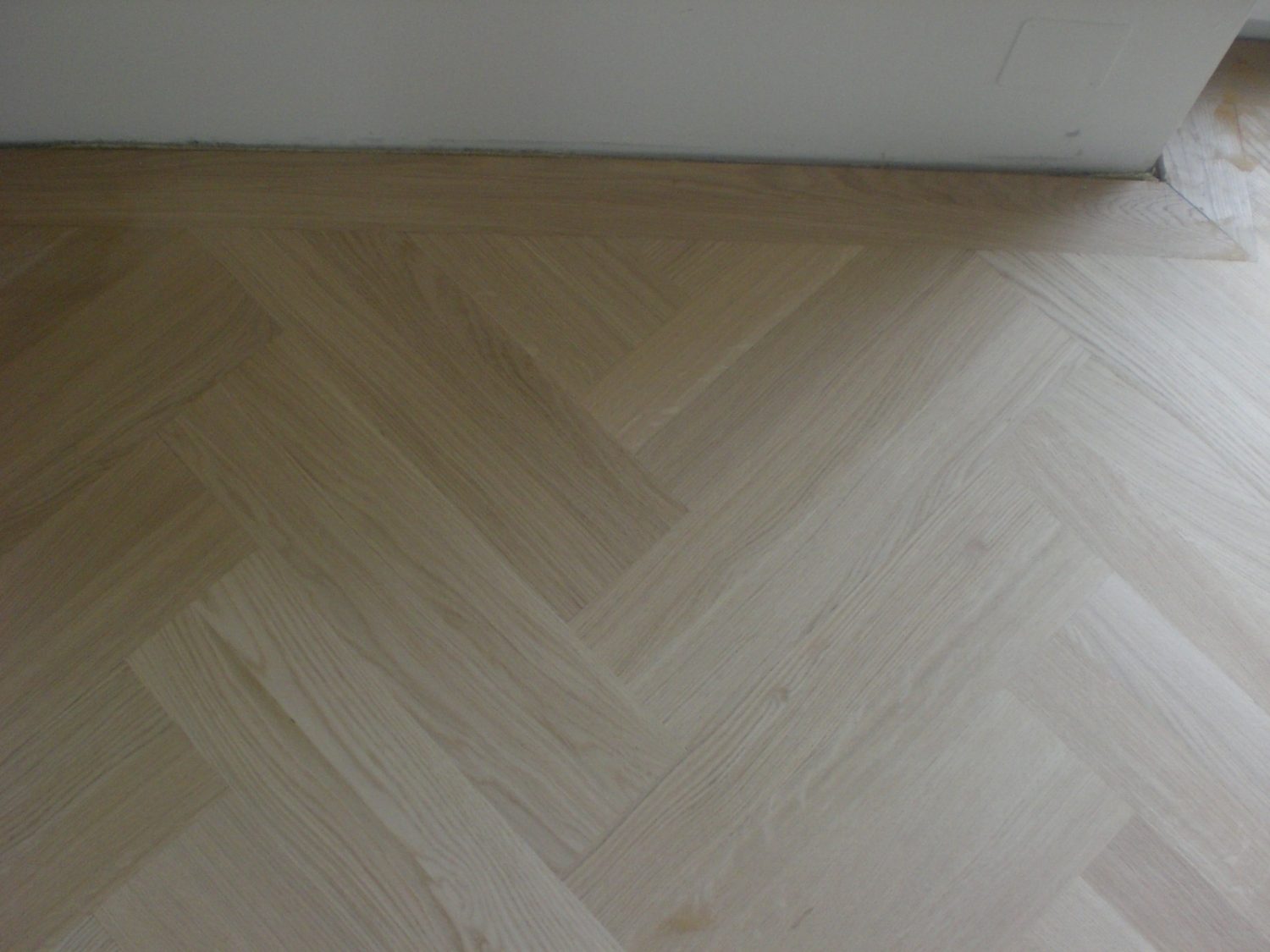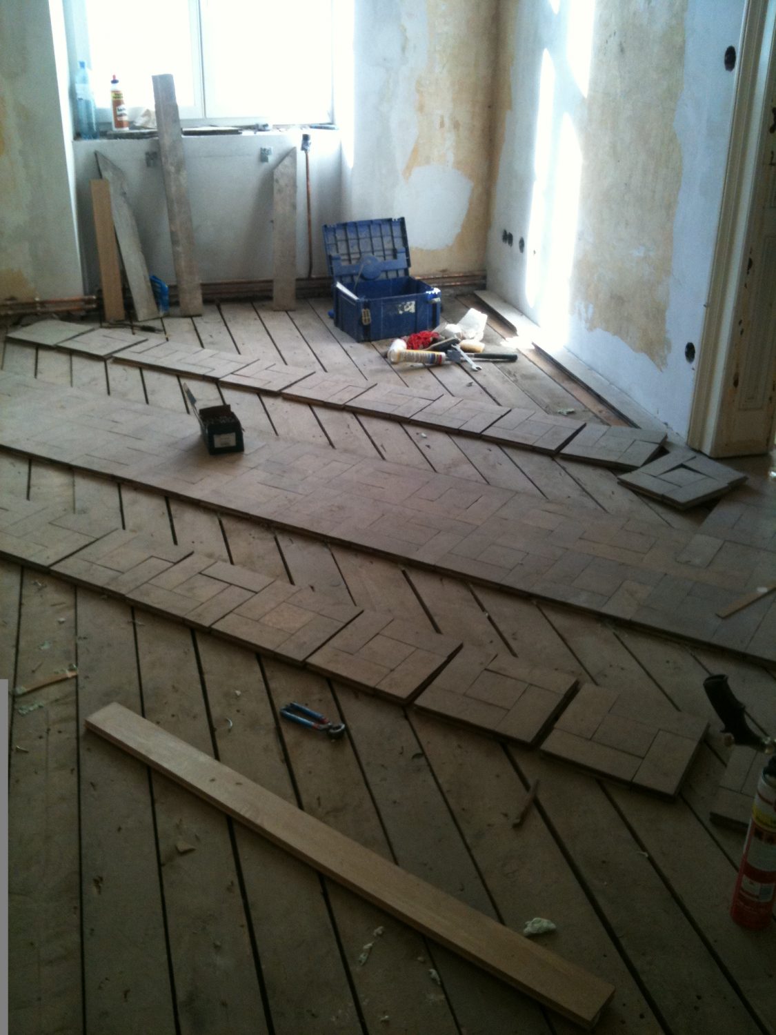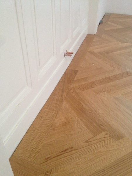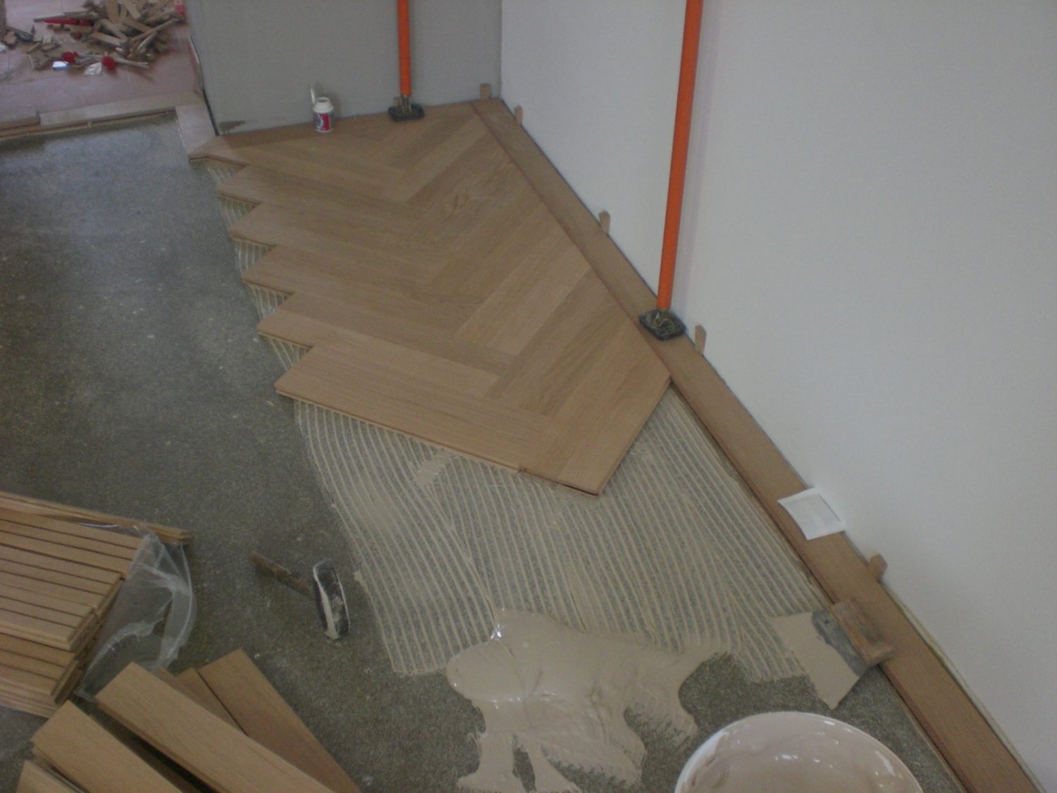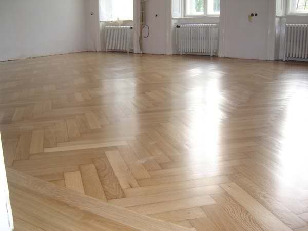 Unterboden ausgeglichen und Verlegeplatten ausgelegt. Anschließend Stabparkett in mehrfach Fischgrätmuster verlegt, vollflächig verklebt.