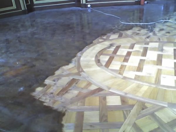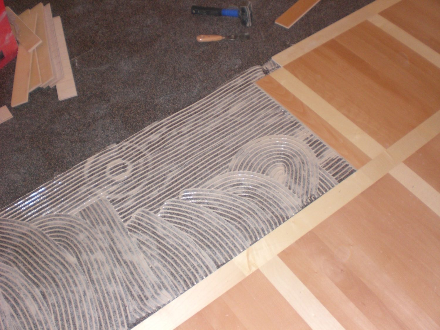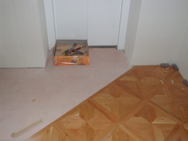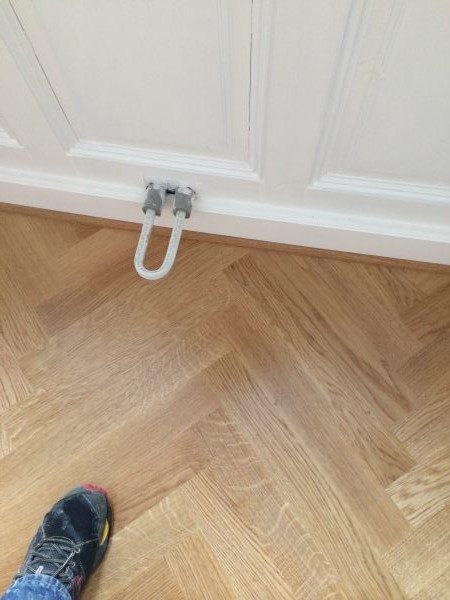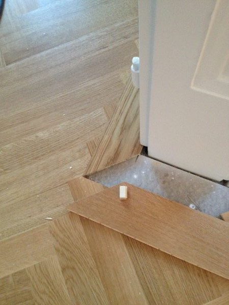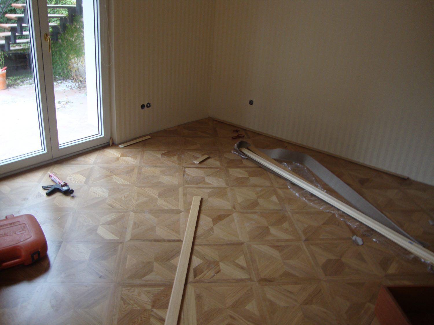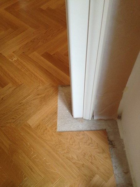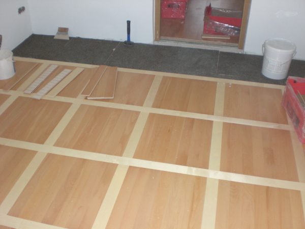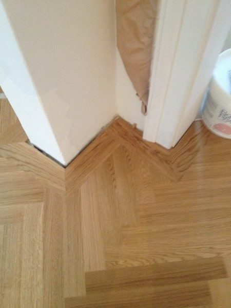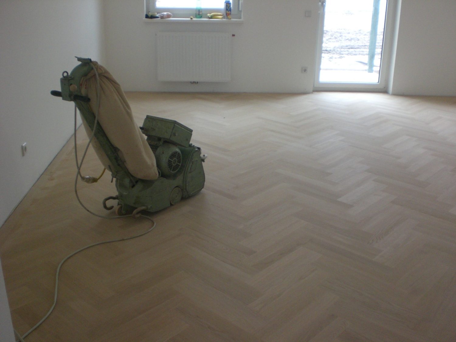 Unterboden ausgeglichen und Verlegeplatten ausgelegt. Anschließend Stabparkett in mehrfach Fischgrätmuster verlegt, vollflächig verklebt.
