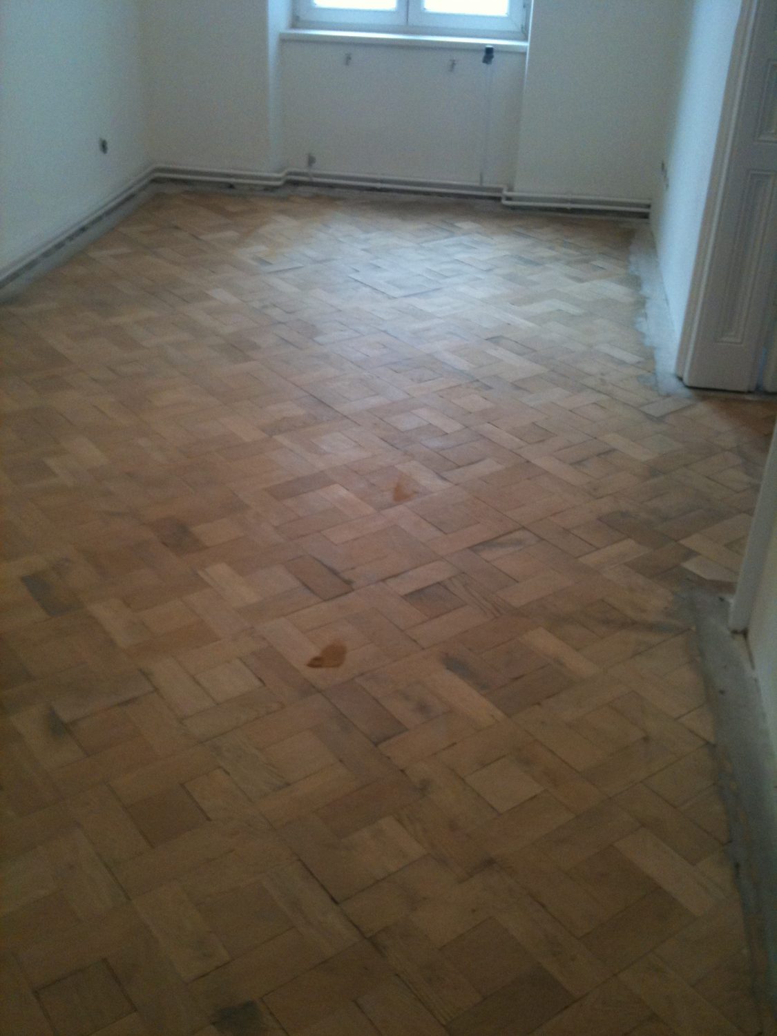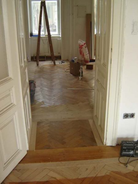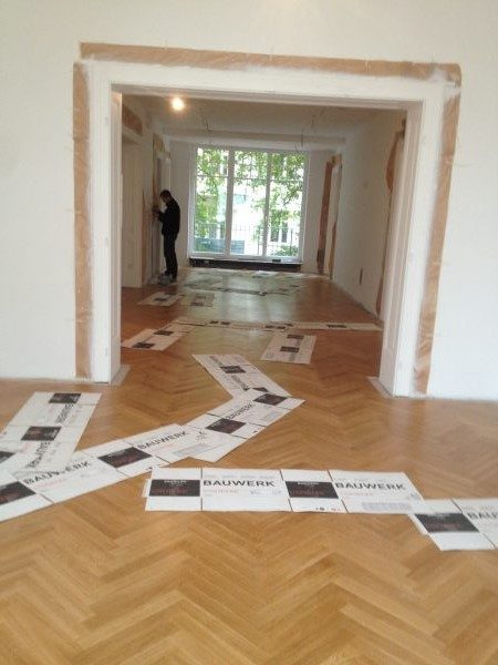Der bestehende Fischgrät-Stabparkett wrude vorsichtig ausgelöst, gereinigt, entnagelt und sortiert. Der Unterboden wurde abgetragen und entsorgt. Mit einer Trockenschüttung wurde der Boden ausgeglichen und Verlegeplatten Nut-Feder verlegt. Darauf wurde der alte alte Stabparkett wieder in Fischgrätmuster zwischen Mauerfriese verlegt, vollflächig verklebt, geschliffen und versiegelt.
