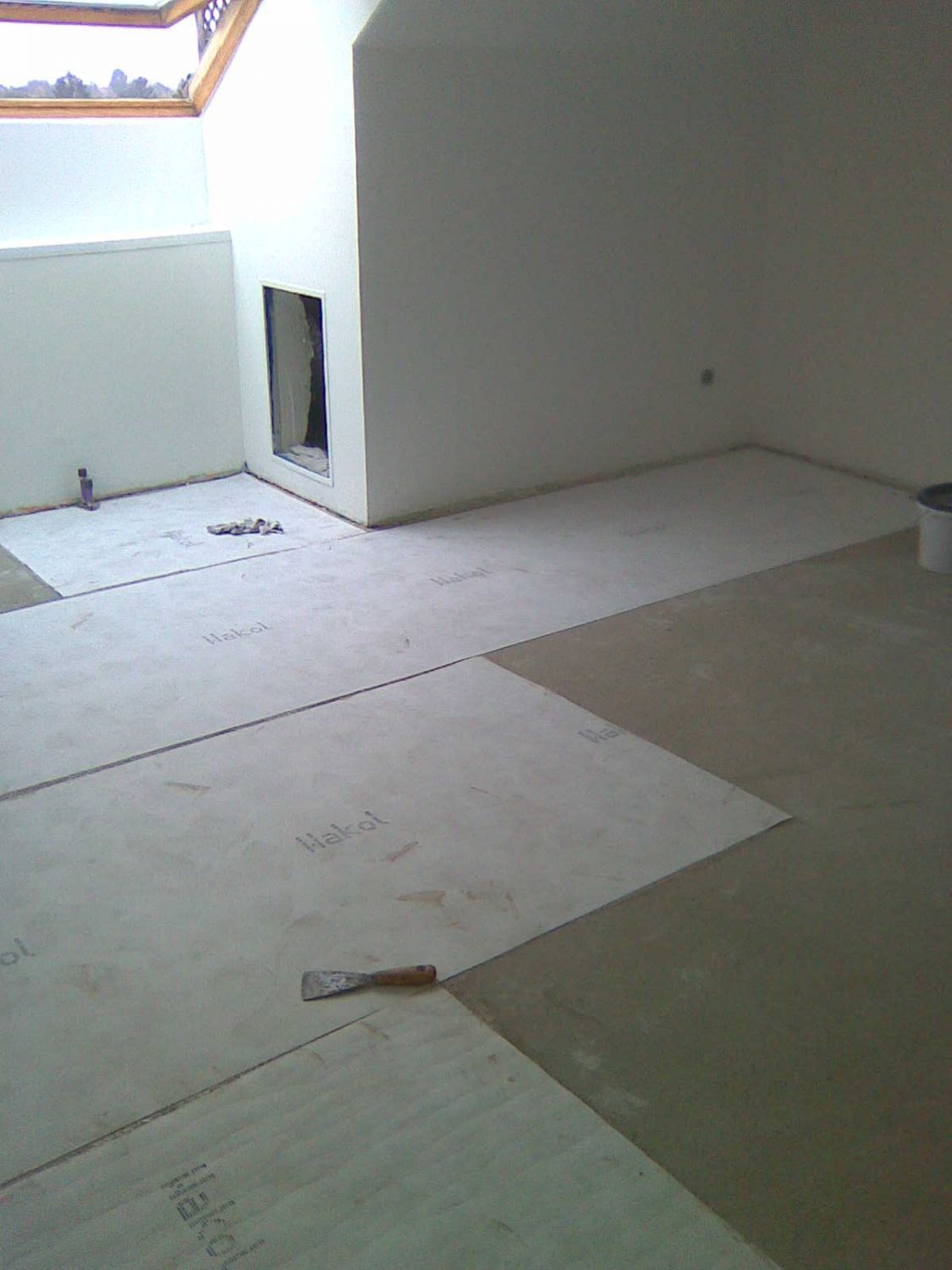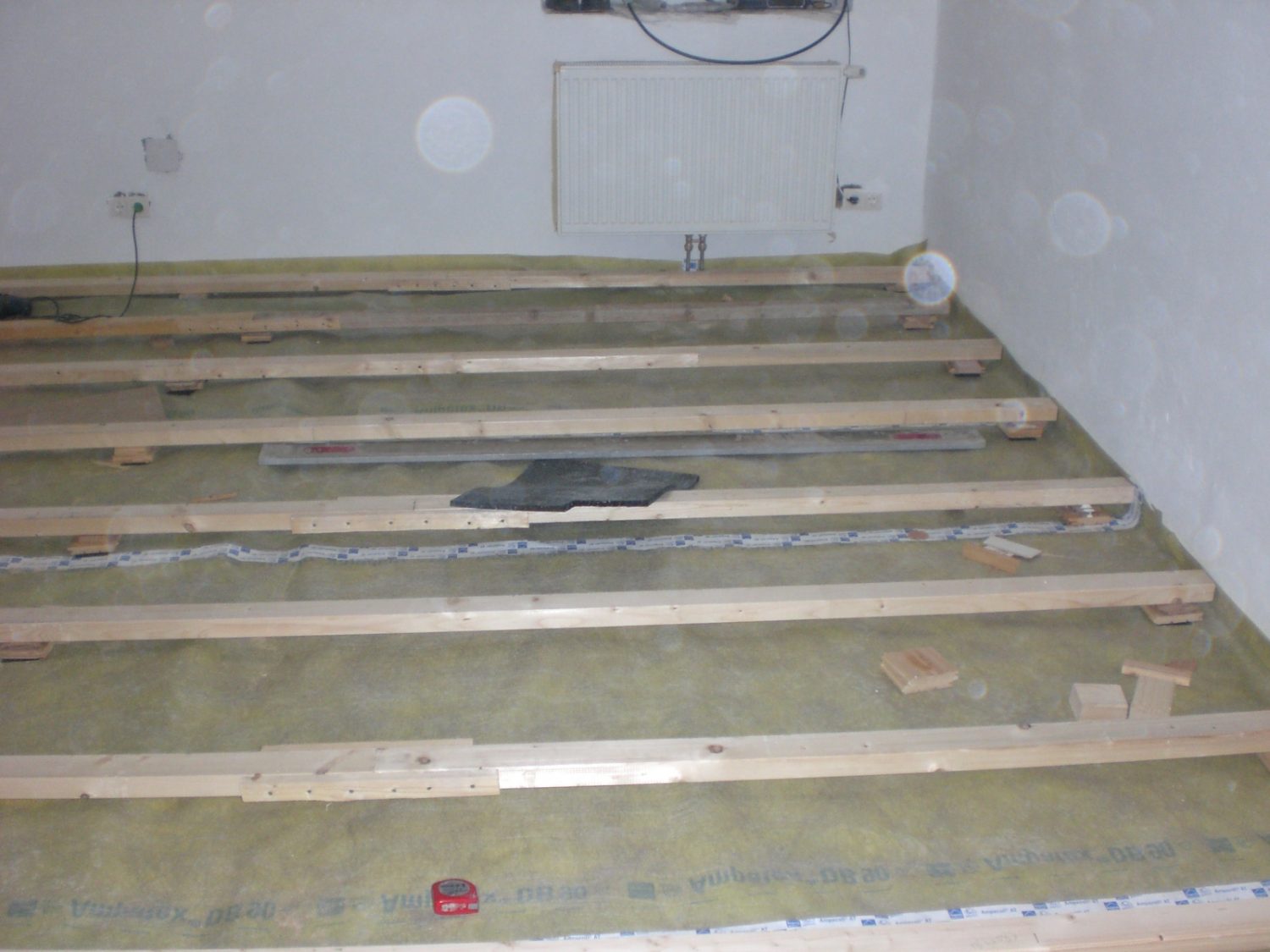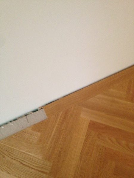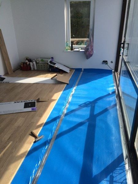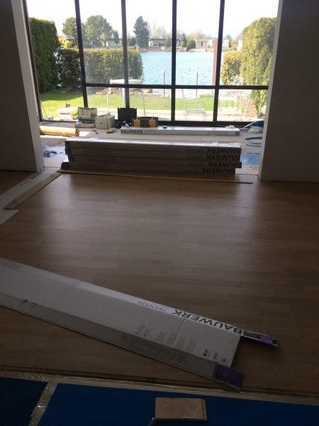 In diesem Wochenendhaus haben wir die Dampfbremse fachgerecht verlegt, die Stösse auch zu Abschlussschienen verklebt. Fertigparkett verlegt und Sockelleisten angebracht.