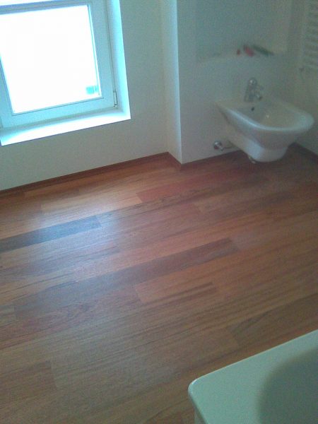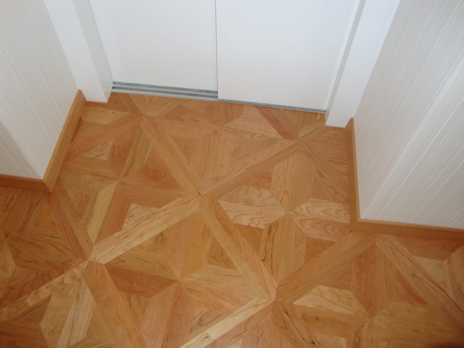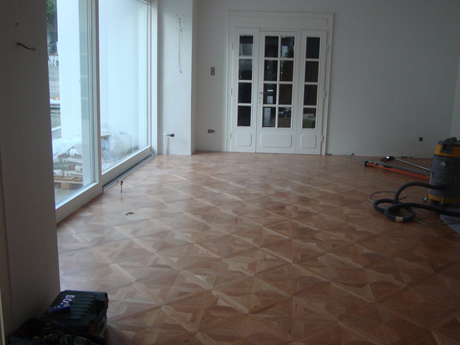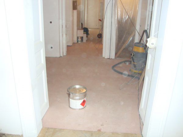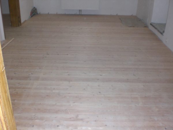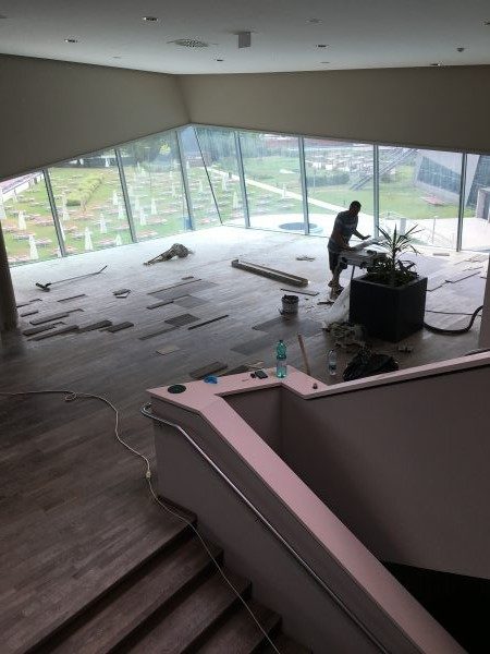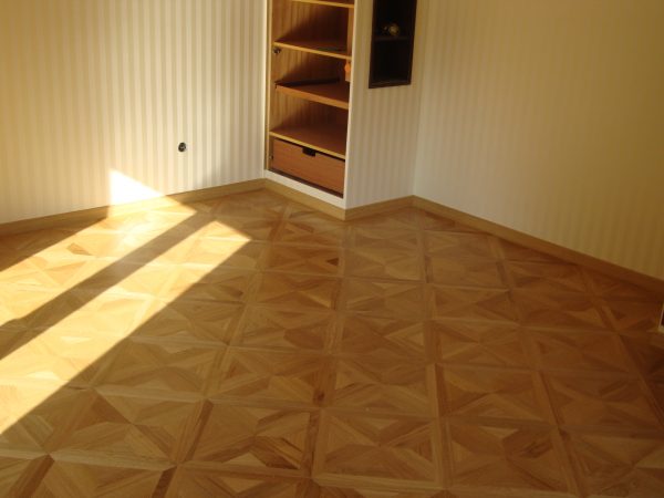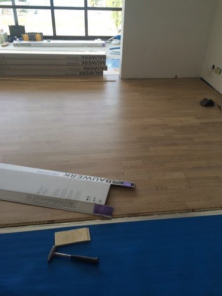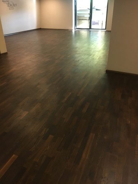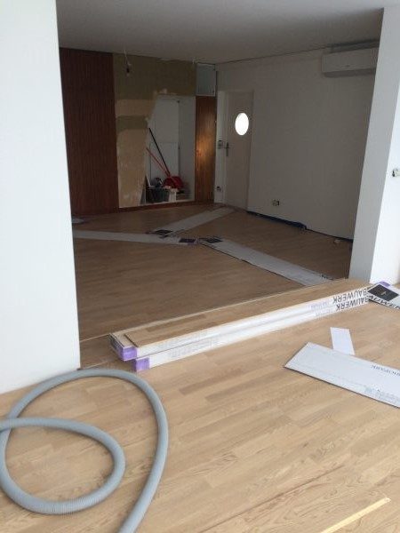 Als Unterkonstruktion wurden ca. 200 m² Verlegeplatten verwendet. Darauf wurde Sternparkett Eiche lackiert sowie Amerikanische Kirsche verlegt und die Sockelleisten montiert.