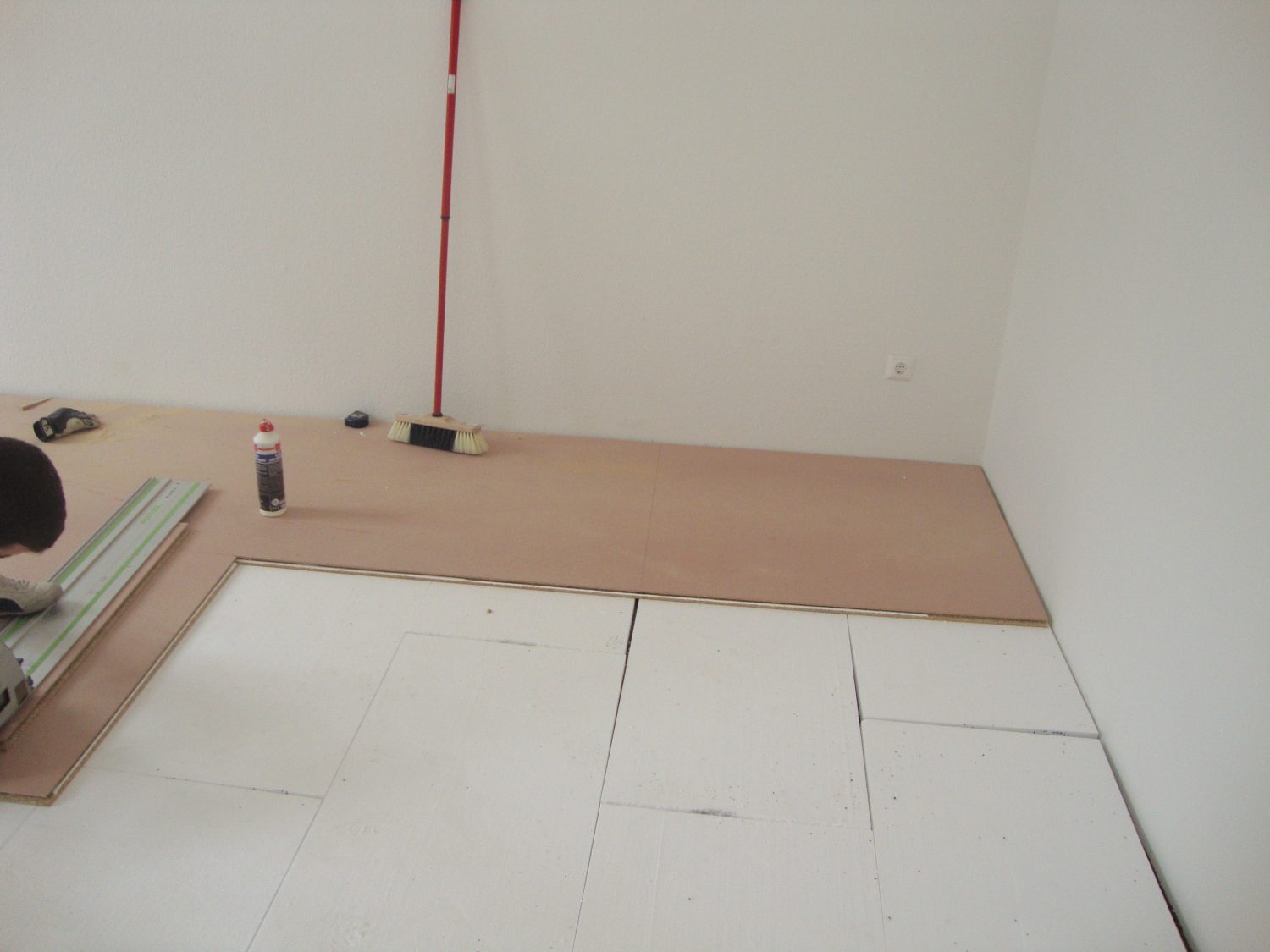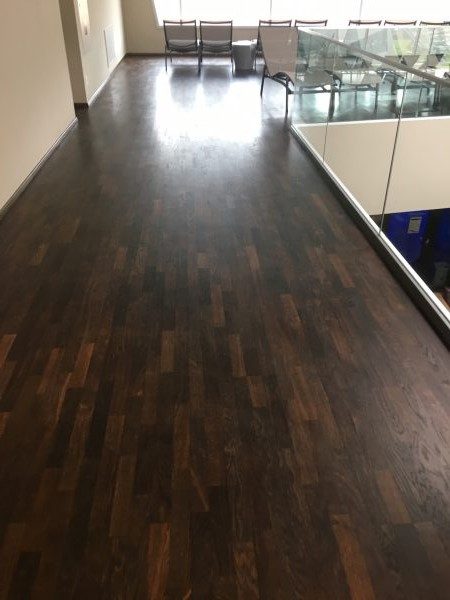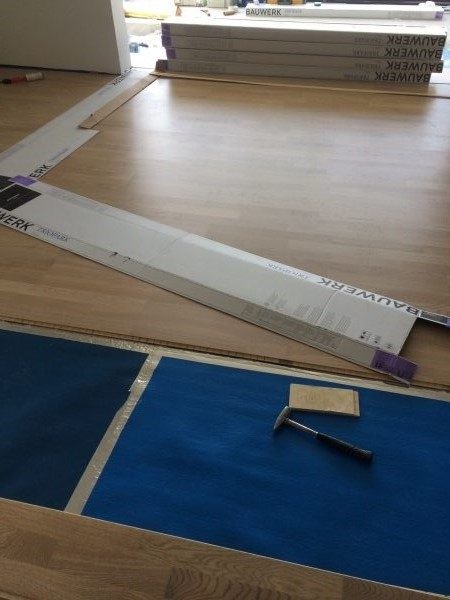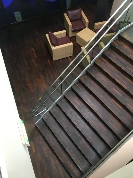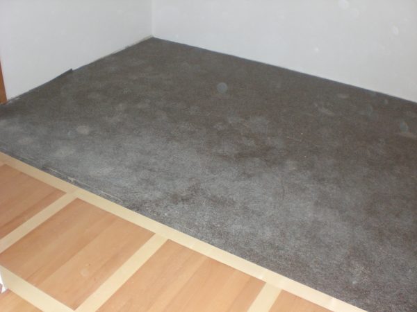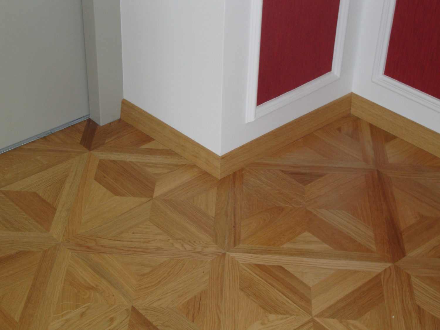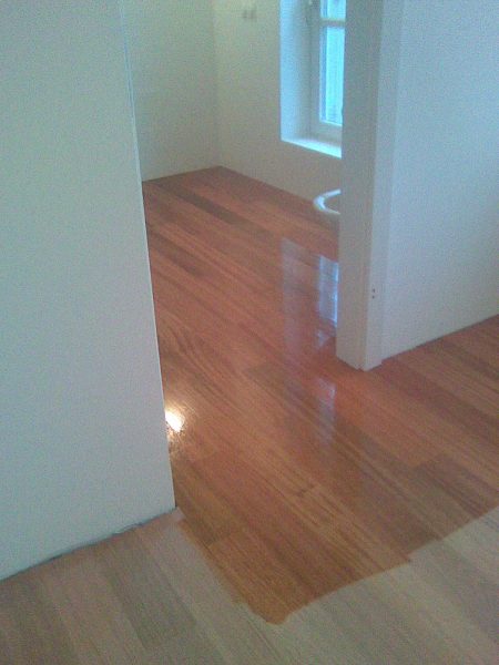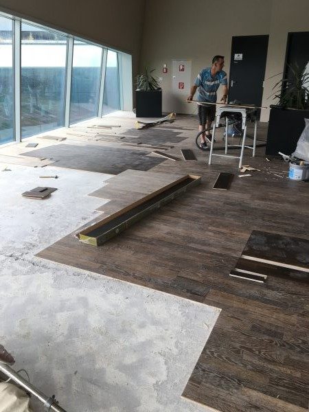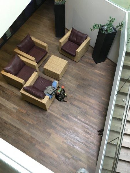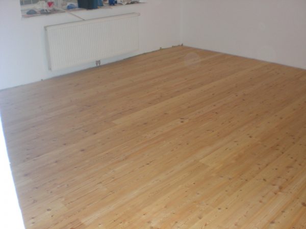 Als Unterkonstruktion wurden ca. 200 m² Verlegeplatten verwendet. Darauf wurde Sternparkett Eiche lackiert sowie Amerikanische Kirsche verlegt und die Sockelleisten montiert.