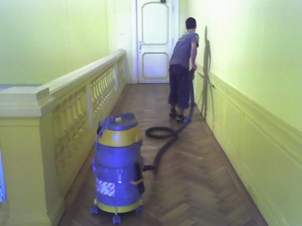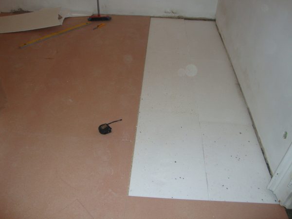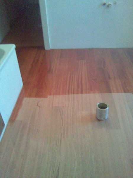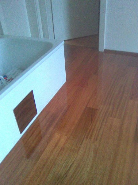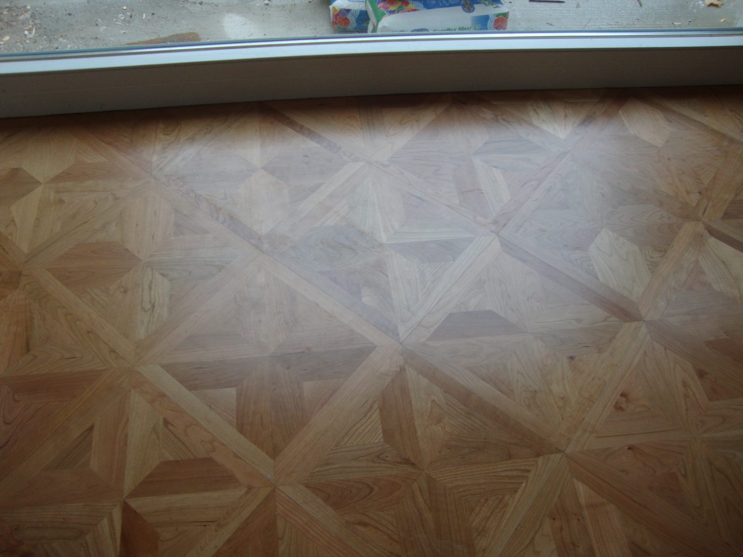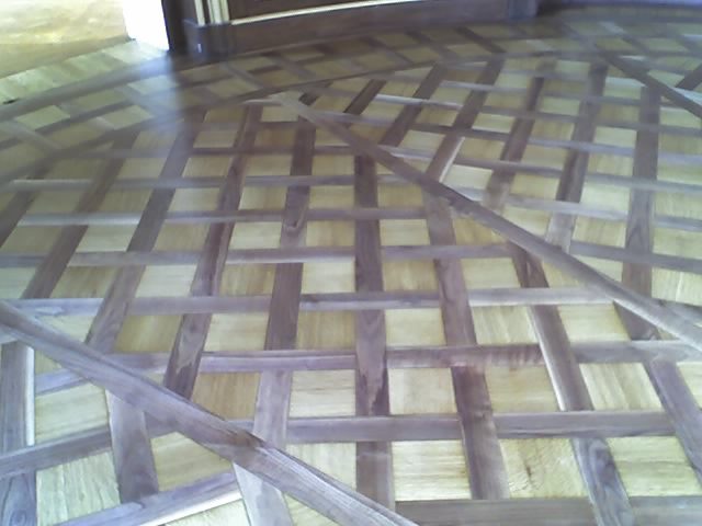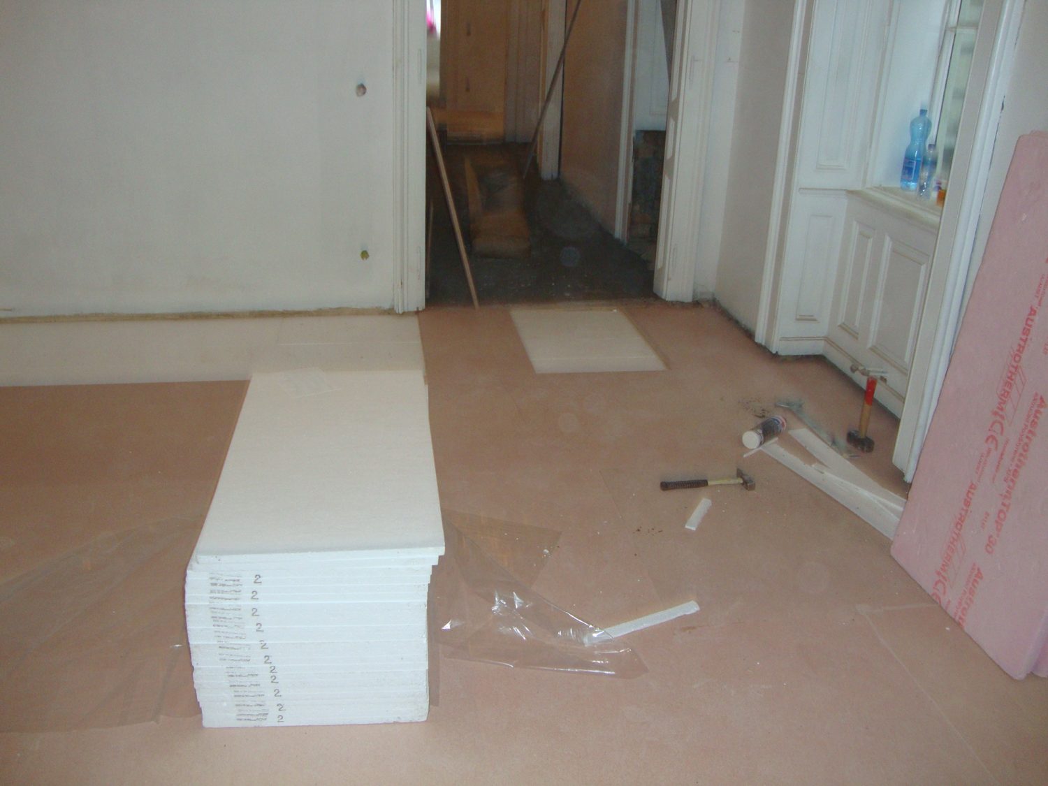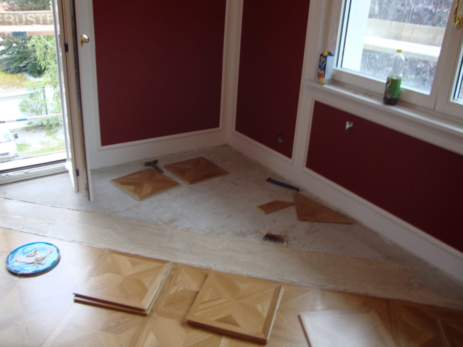 Als Unterkonstruktion wurden ca. 200 m² Verlegeplatten verwendet. Darauf wurde Sternparkett Eiche lackiert sowie Amerikanische Kirsche verlegt und die Sockelleisten montiert.