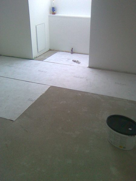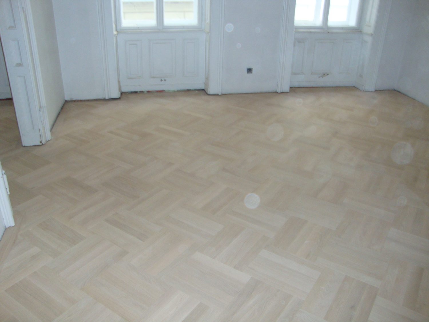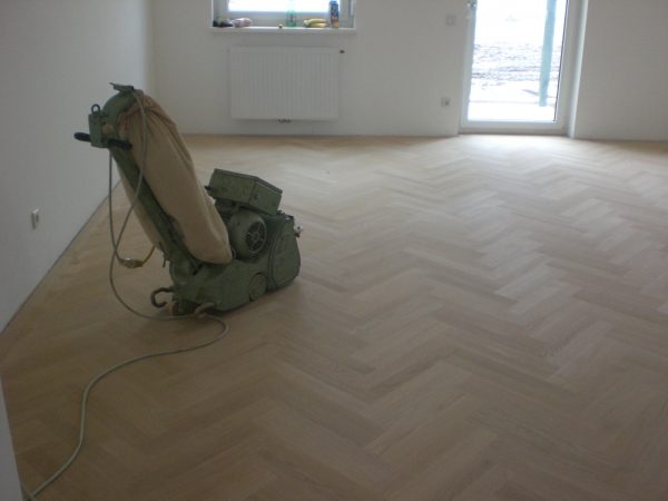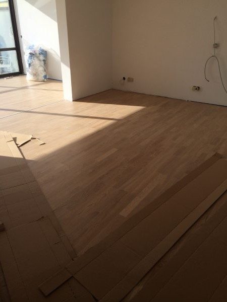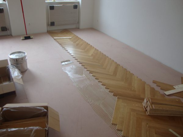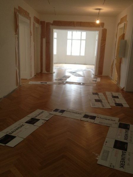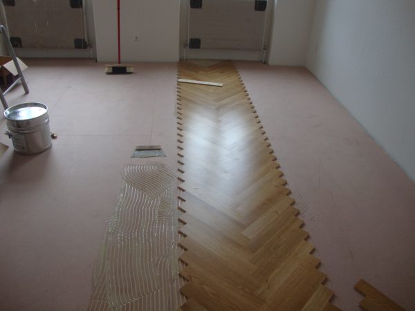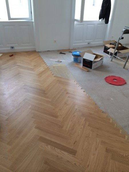 Projekt in 1190 Wien, ca. 220 m² Unterboden nivelliert und Verlegeplatten verlegt. Auf dem Unterboden wurde ein Eiche Fertigparkett, lackiert, in Fischgrätmuster verlegt und vollflächig verklebt.