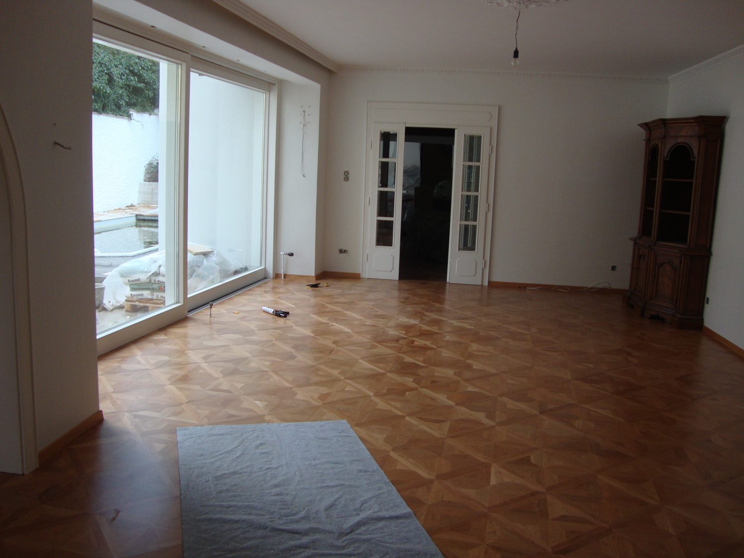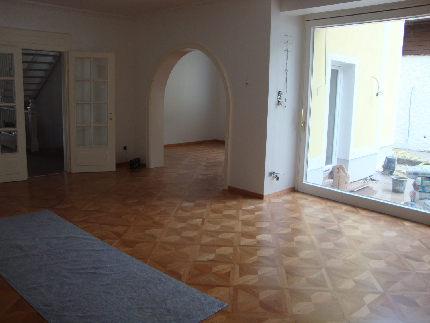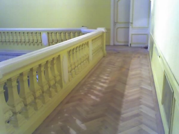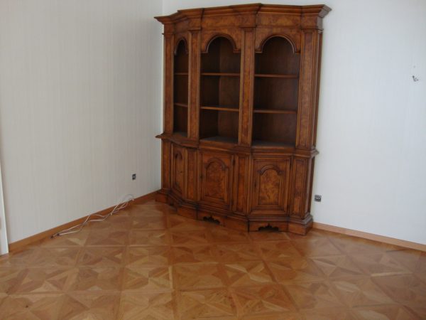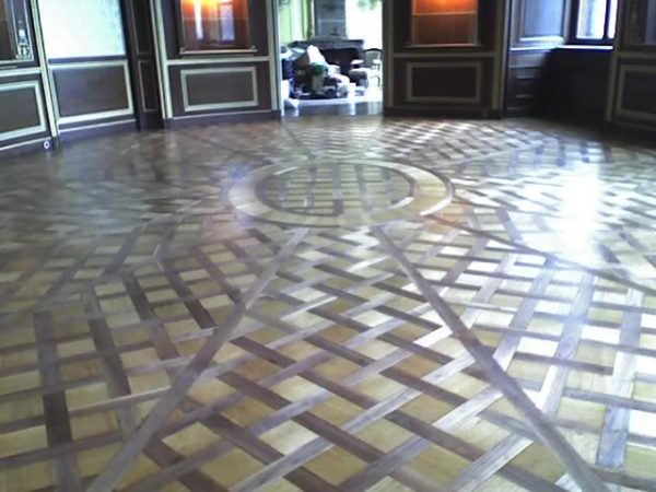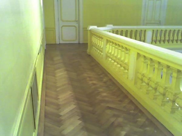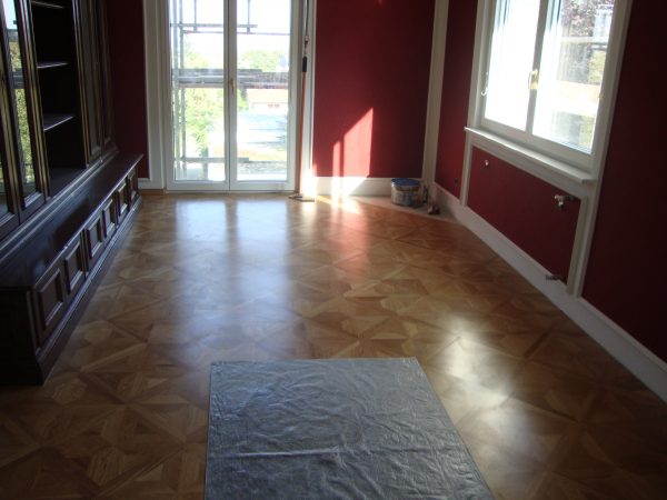 Arbeiten im repräsentativen ovalen Empfangssaal mit ca. 150 m². Alte Intarsien teilweise ausgetauscht, gesamten Boden geschliffen und versiegelt.