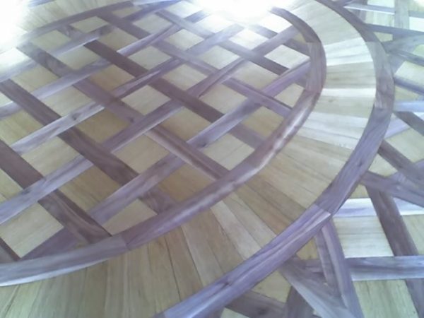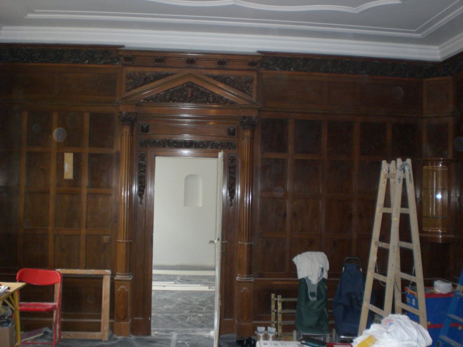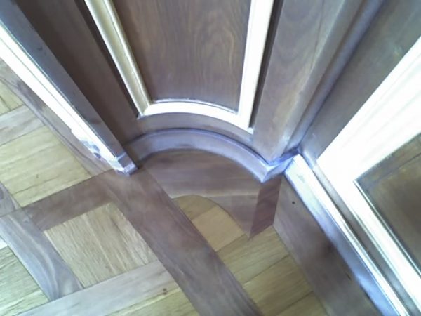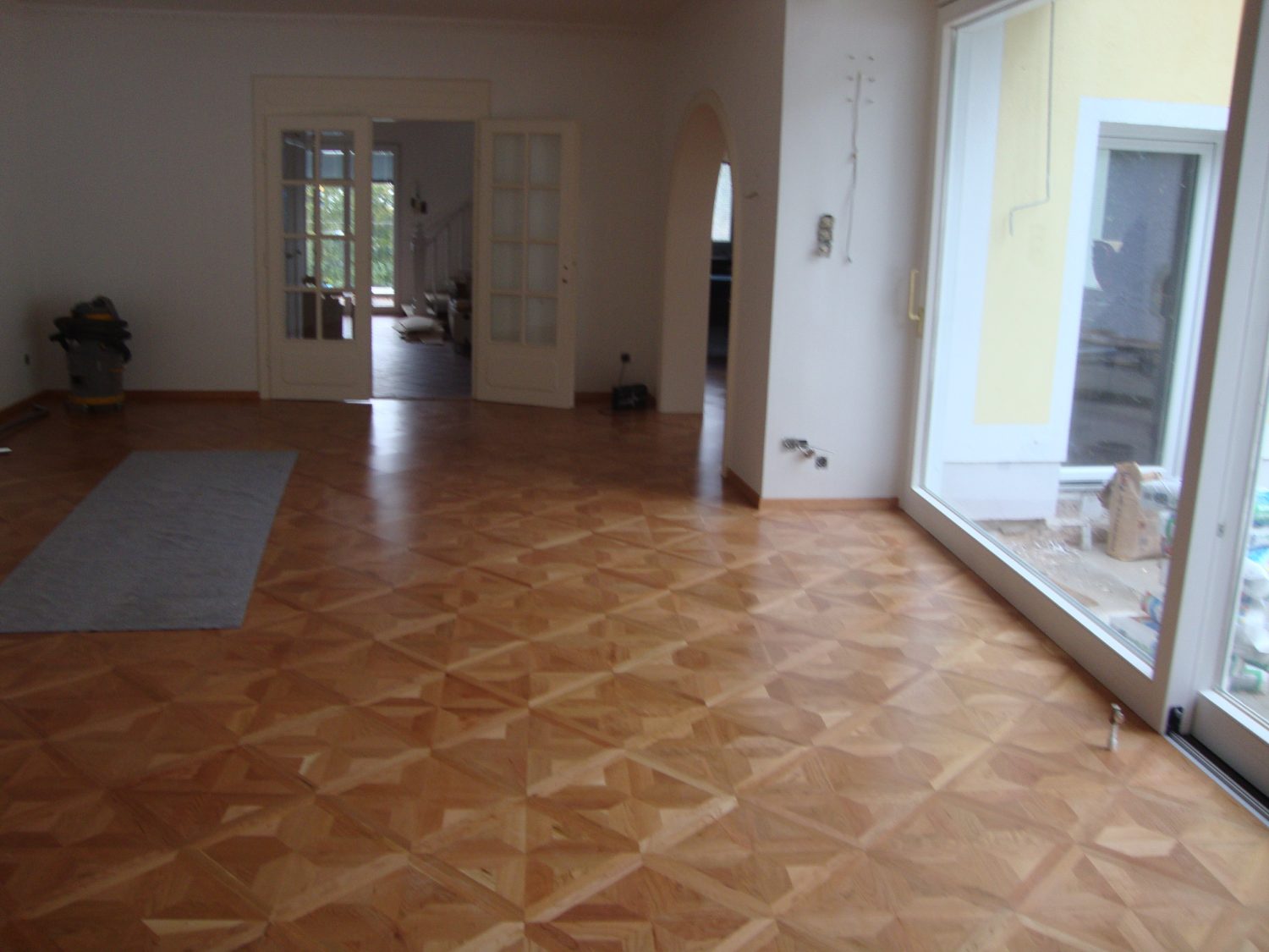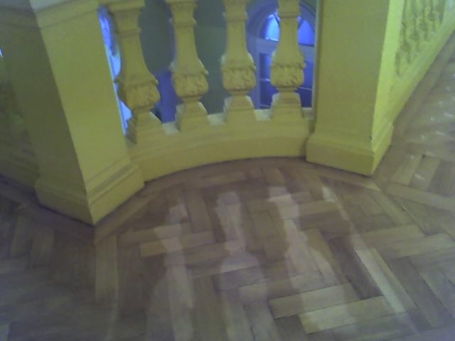 Arbeiten im repräsentativen ovalen Empfangssaal mit ca. 150 m². Alte Intarsien teilweise ausgetauscht, gesamten Boden geschliffen und versiegelt.
