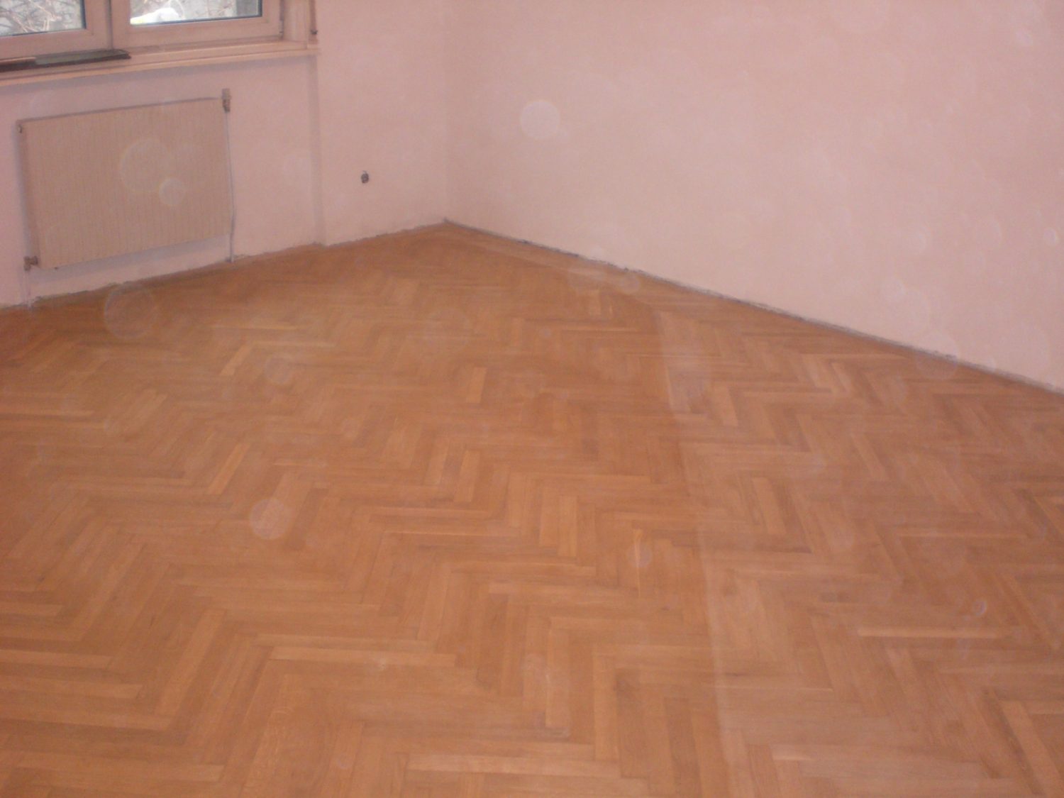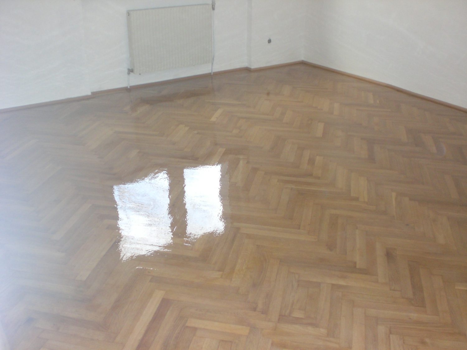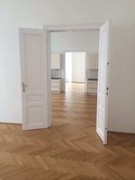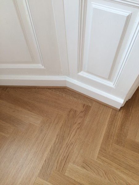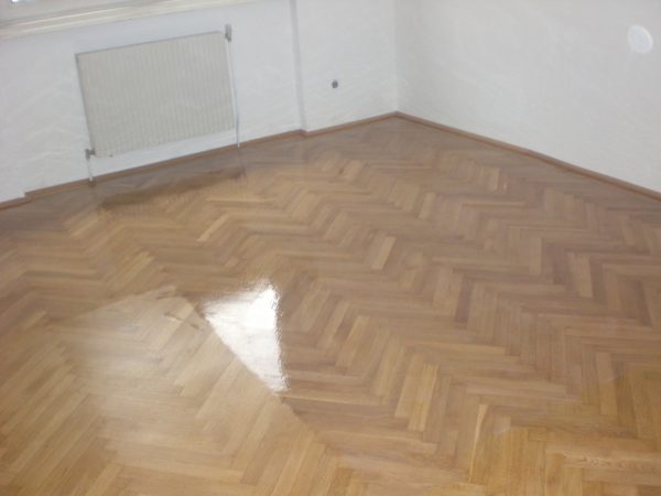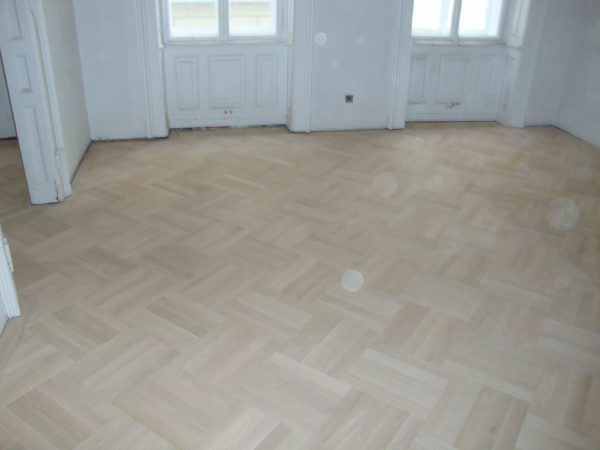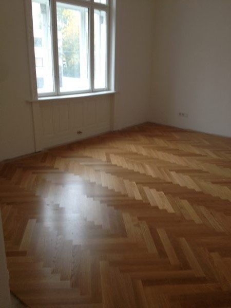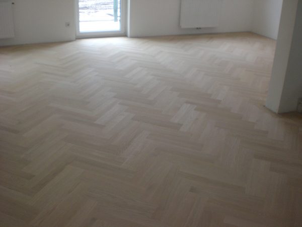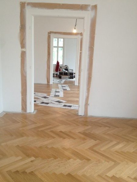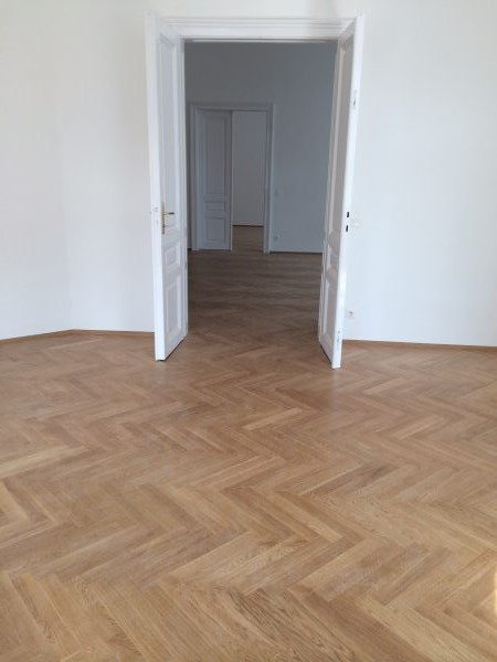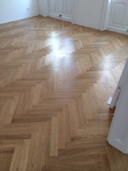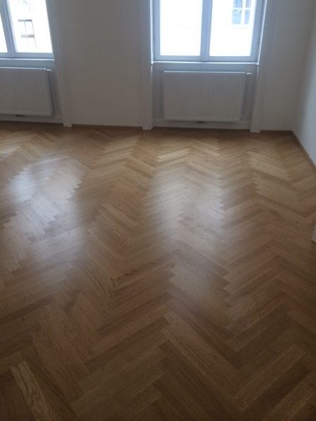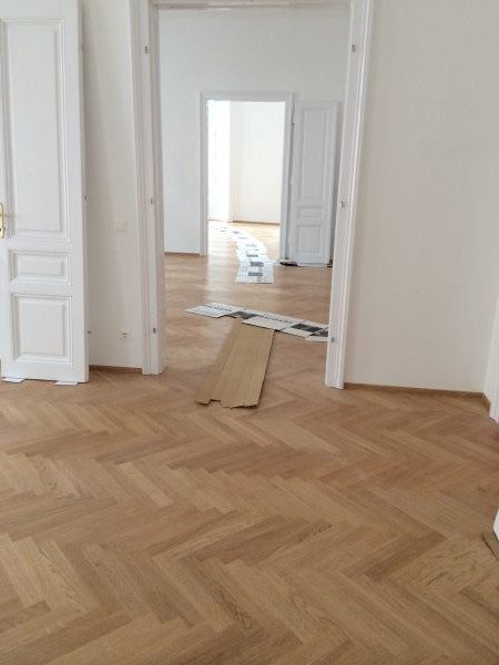 Eiche Fertigparkett lackiert, in Fischgrätmuster auf von uns nivellierte und neu verlegte Verlegeplatten verlegt und vollflächig verklebt. Projekt in 1030 Wien, ca. 160 m².