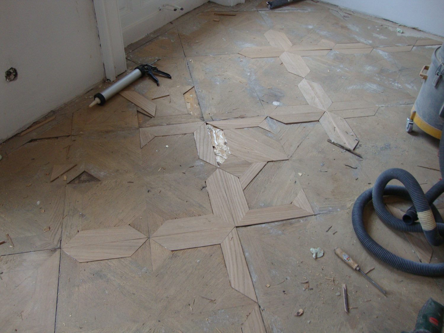 Äußerst desolater Sternparkett in Jahrhundertwendehaus restauriert. Kaputte und verbrauchte Furnier ausgetauscht und abschließend geschliffen und geölt.